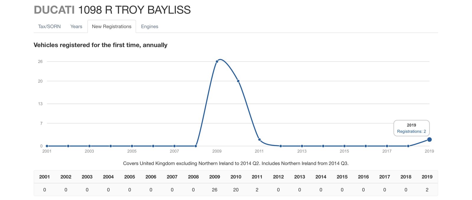 Are you sure you are looking at it right? The 1198 R Corse shows as 4 being originally registered in 2010 and in Q2 2019 1 was taxed and 3 registered as SORN so looks like they are all still around. Still - that’s pretty fecking rare! Where the extra one came from in 2016 I don’t know but it seems to have dematerialised again!