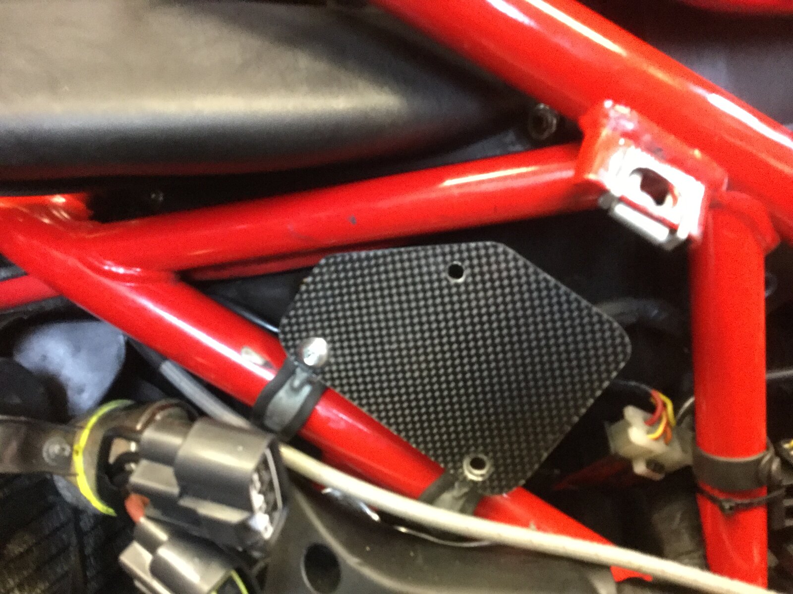 I did consider an ally plate for its heat sink properties but opted to use the carbon because: a) It was just there on my shelf b) it was thin and easy to cut and file c) it was already predrilled for the hose clips (it had been used as a PC111 mount on my trackbike) d) It was lightweight e) The MOSFET RR runs cooler and the location was further away from the shittest place in the world that Ducati sited the original RR f) It scores higher on the bling-o-meter!