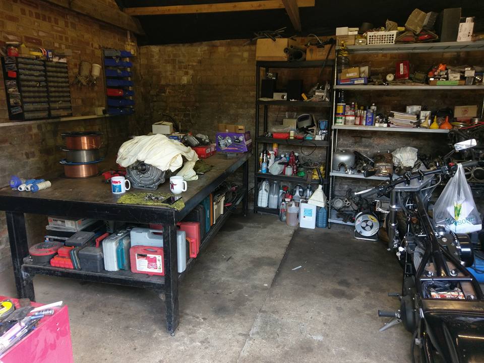 18. I have 2 workshops - a 20'x30' which is predominately the 'messy' shop - my father in law is currently doing some woodworking in there, but its where my lathe and mill are, along with chop saws etc - and a smaller one about the size of a single garage which is where I do my 'engineering' and clean stuff like engine builds and painting etc. Here's about half of it. Other half is full of bikes and welding gear... The 996 will be getting moved into the 'clean' shop tomorrow night.