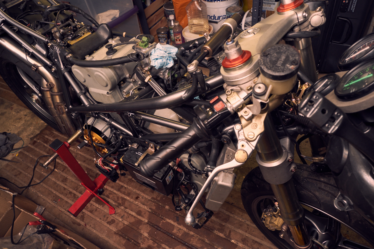 Not much more I can do on the bike now (said no one ever). Tank, fairings and rear shock are with their respective specialists. I've assembled everything that looks essential. I have the requisite handful of bolts leftover (well many were replaced with newbies). So until I get the last parts back from the doctor the bike is, I sincerely hope, as ready as it can be. With some luck I'll be assembling the final pieces of the bike next weekend.
