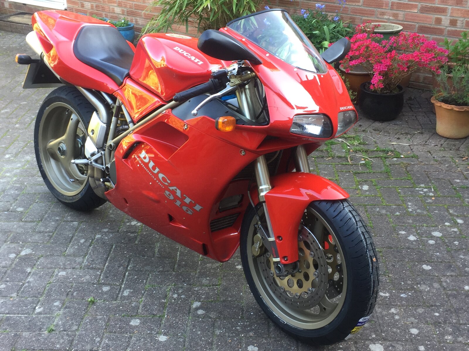 The bike in question is a 916 Biposto England MY1995, sold to the English importer Three Cross Motorcycles LTD on January 27, 1995, and registered to the first owner on February 11 of the same year. Frame and engine serial numbers match, and they are same of when the motorcycle left the factory. This bike was produced in 258 pieces in 1995. It is part of the 916 production started in Ducati Motor Holding from January 1995, and has nothing to do with the 916 produced in 1994 in Cagiva, in Varese.