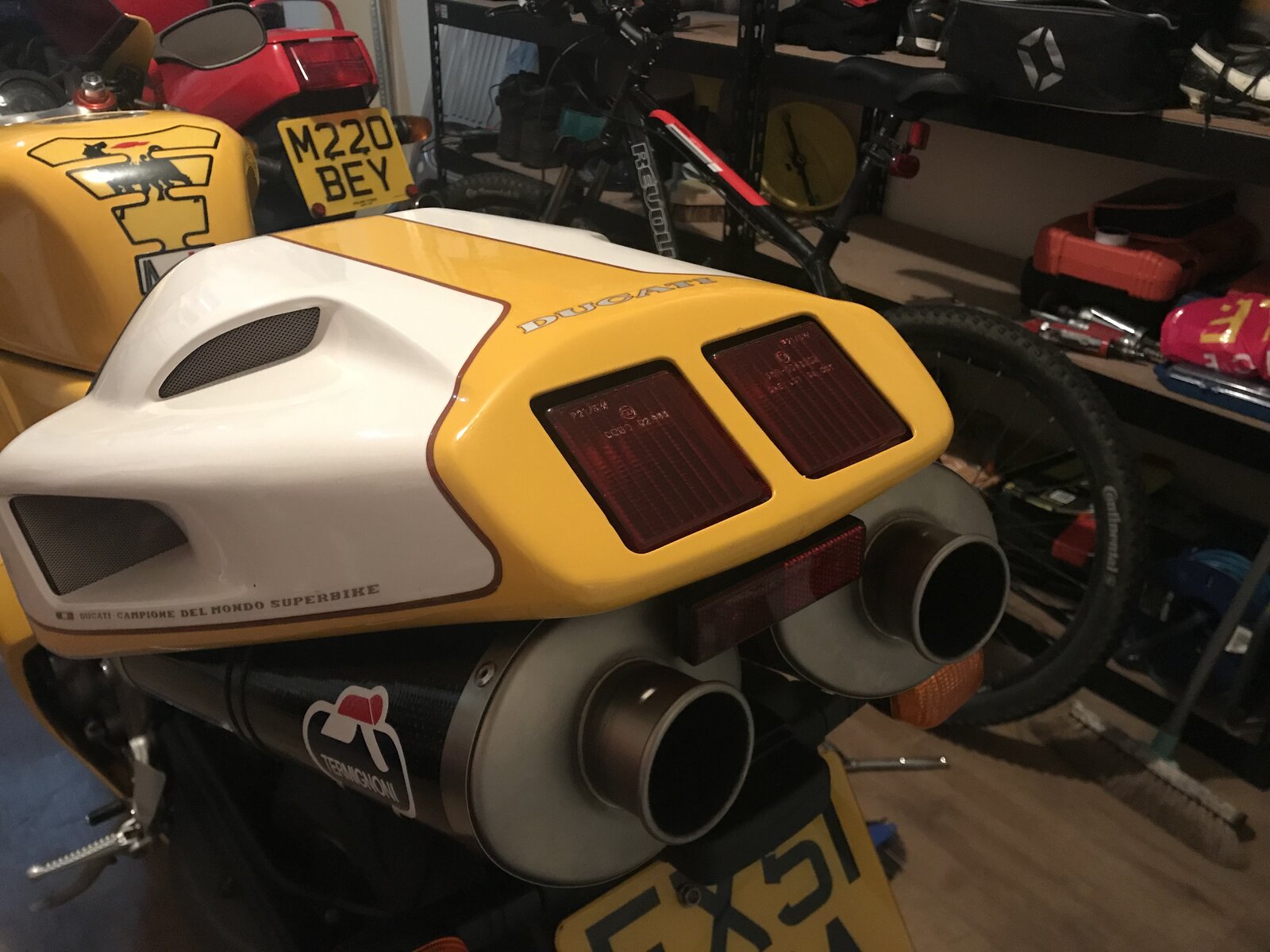 All still well with the bike, the oily mess hasn’t returned, lights are all in good working order and the oil level seems to be staying pretty constant. Lost another bolt, one of the ones for the v-fairing below the rad parted ways with the bike at some point so need to sort that. August was a good month, took a trip to Thunder in the Glens with my father in law and a couple of his mates, stood out like a sore thumb on my yellow Duc Also had my first outing on track at Knockhill with the Niall MacKenzie Superbike School. What an incredible day, definitely bitten by the track bug now. First couple of laps were pretty overwhelming but I think I made decent progress over the day. Finally, I accidentally purchased some Akrapovic cans for the bike from eBay (they’d also been listed on here). Quality is amazing and they are incredibly light compared to the standard cans. Had a go at fitting them tonight but the original clamps are too small and the carbon ones are a bit of a rattly fit (not sure if I need to put a rubber liner in them?) so have whipped them off and hidden them from the mrs again Did start the bike with them and they sounded gorgeous!