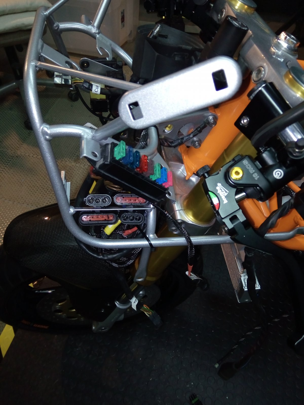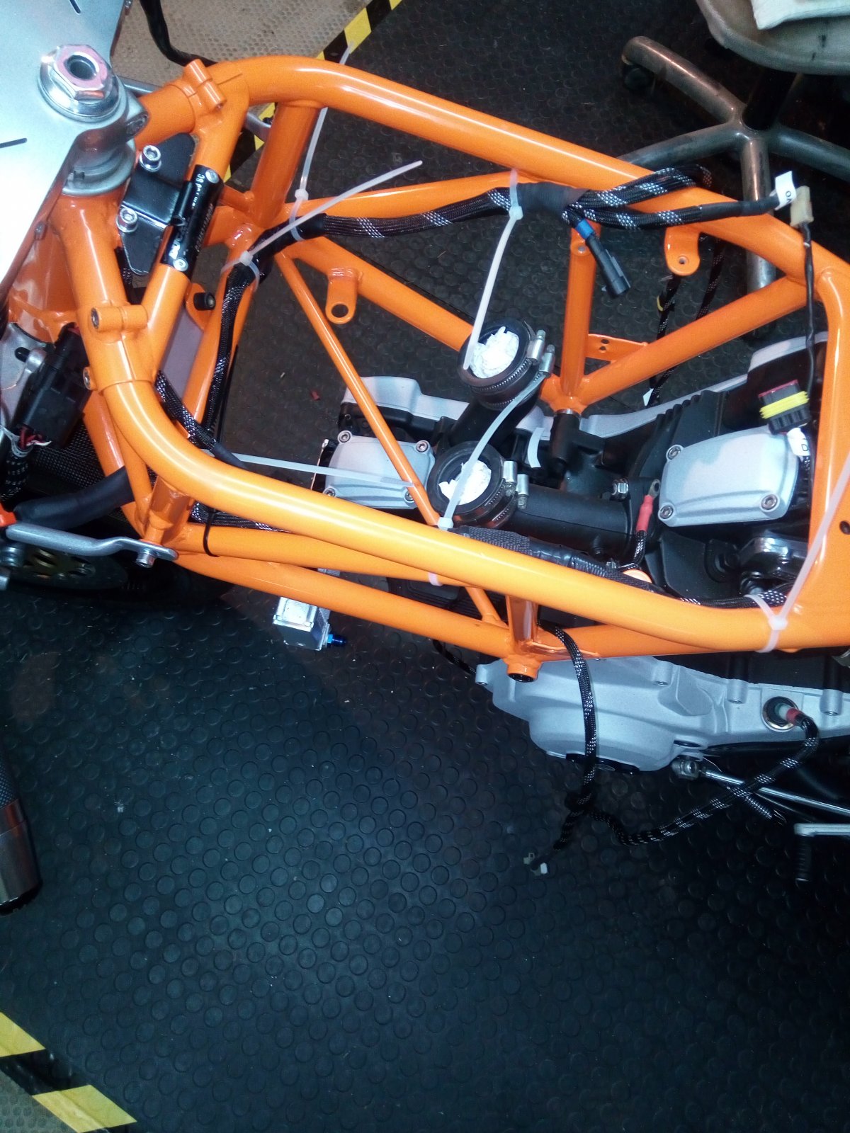 More advances made during this sunny and quiet easter period (Happy Easter to everyone :smiley A friend of mine said that this paint scheme made the bike "dangerously look" like a KTM! and it was loosing its italian character, If someone tells me that mi wife looks like Claudia Schiffer, I would not be very much worried, but, anyhow, I took his comments into consideration and made one little ammendment. I hope he now finds sufficient italian accent :tearsofjoy::tearsofjoy::tearsofjoy::tearsofjoy: Now, let's be serious Rear end back in place with re-polished rear light and recovered plastics Also front subframe in position and began rewiring Thanks a lot for the posted wiring diagram! it makes things much more easier:hearteyes: Wiring is a mess, and there is still all this loom to be put back in place :coldsweat::coldsweat: Should I do it before or after installing the battery box?. I,m building a new all alluminium battery box that will save space and allow using pod filters, and I'm wondering if the cables should be installed before it Any help on this? Also, I do not like the looks of the black zip ties over the orange frame I will search for Orange Zip ties Thats all for now, new carbies on their way, and painting season is getting closer. best Tom