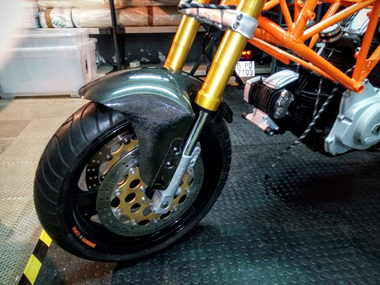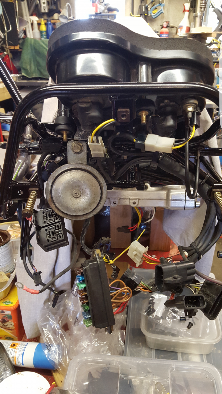 Some progress has happened over the past two weeks. First. I received a long awaited parcel with a pair of brand new carburetors. They correspond to a 750 Monster and are already prejetted to that specification. They will require some fiddling, but, as for now, I can continue the build up and later on fix the "breathing" issues that may pop up. Exahusts (nicely ceramic coated) also back in place Also finished the rear brake installation including a new brake light switch connected directly to the banjo bolt. I used this system on my previous build and I'm very satisfied with the results (less mechanical adjustment and also less deterioration due to dust, grease and all that stuff) Also, totally rebuilt and painted the clamp and hinges that secure the tank in position. Finally I started today wiring back the bike. I'm initally using some white zippers not very much tightened to try to figure out the proper way to reroute everything. (lots of trial and mistake here) Hopefully, next week I will have my new battery box finished from the lasercutter and will have the chance to finish all the wiring. This is all for now, By the way! Can anybody post a picture or tell me where the horn is attached to? Haynes is imprecise, and so is the manufacturer's service manual. thanks in advance.