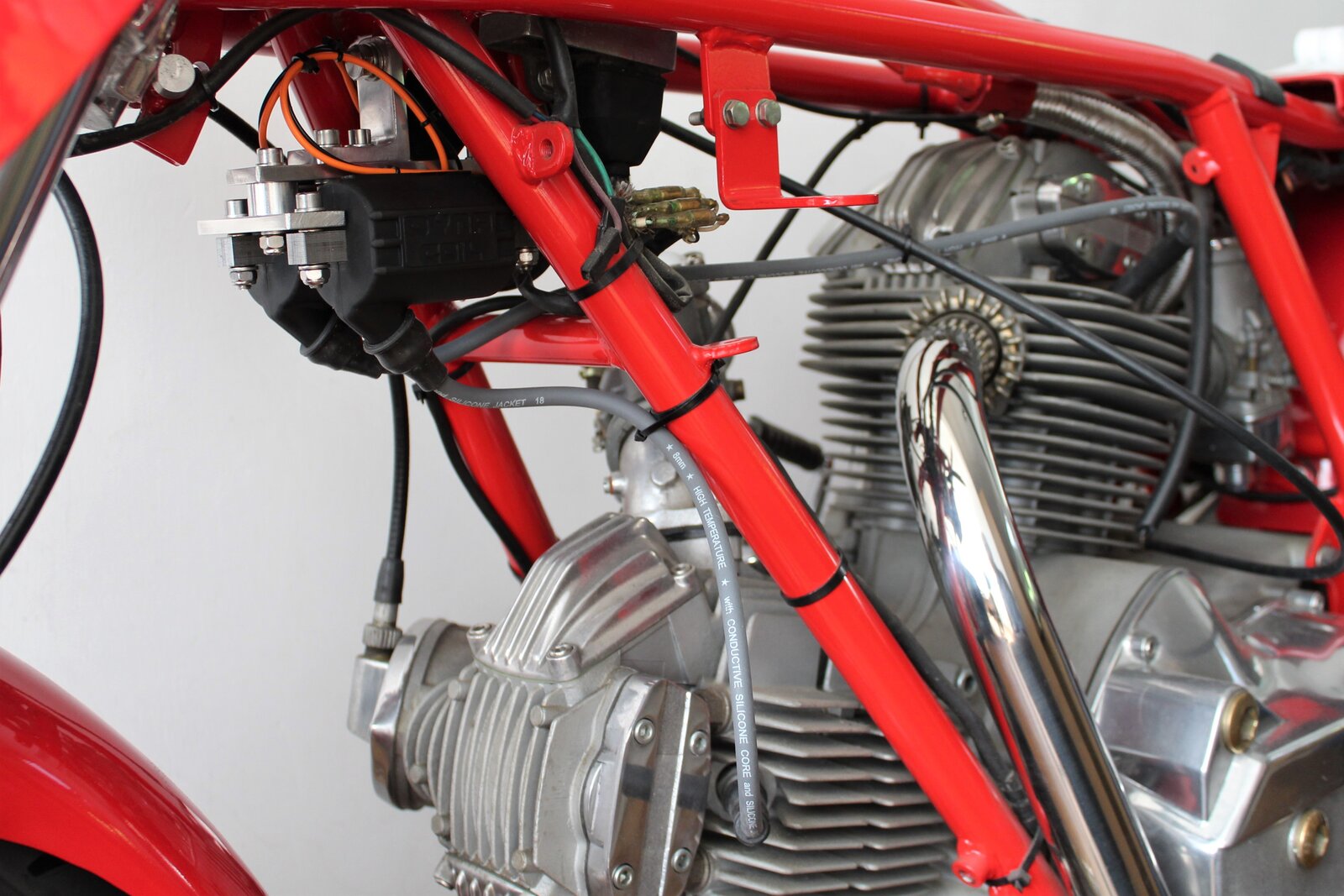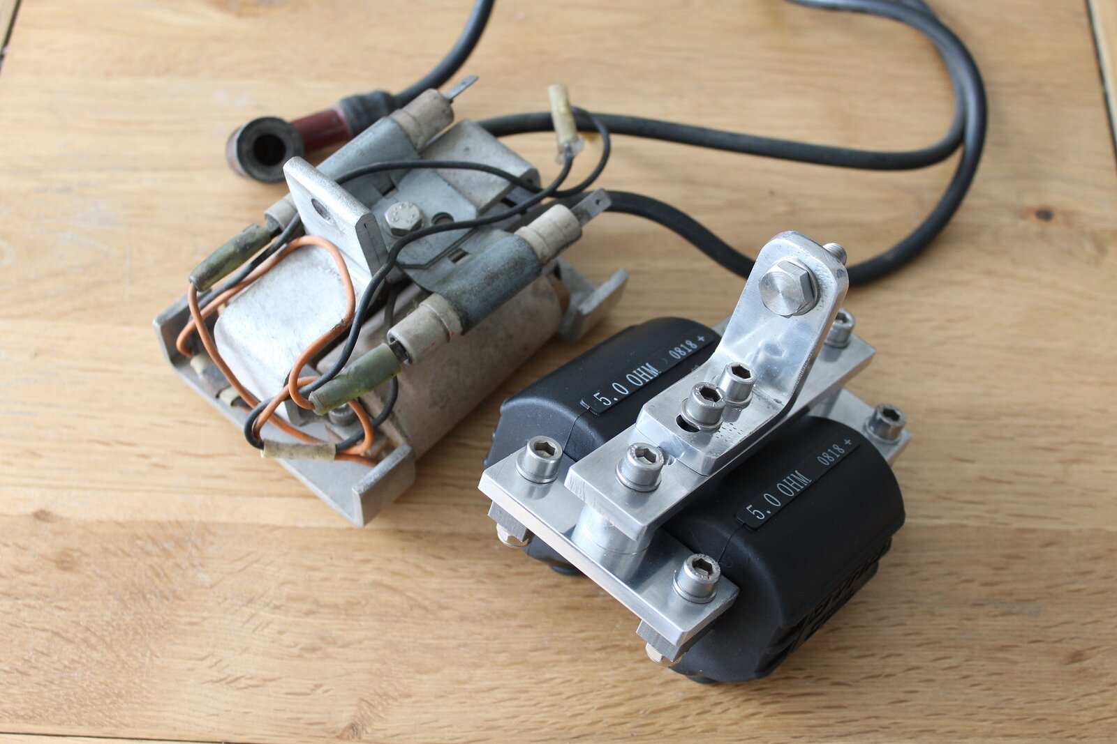 Not had much time to work on the bike recently, but I have replaced the original coils (one of which was damaged) with a new pair of Dyna coils and leads. The new coils are slightly bigger than the originals and wouldn't fit in standard position, between the down tubes under the headstock, nor could I use the standard coil mounting bracket. So I needed to make a coil mount which put the new coils just in front of the down tubes but as close as possible to their original location. Finally accepted I wont find the ignition key, god knows where it is, so bought a new barrel and key.. not cheap at £67, no doubt the old key will turn up soon after I fit it..