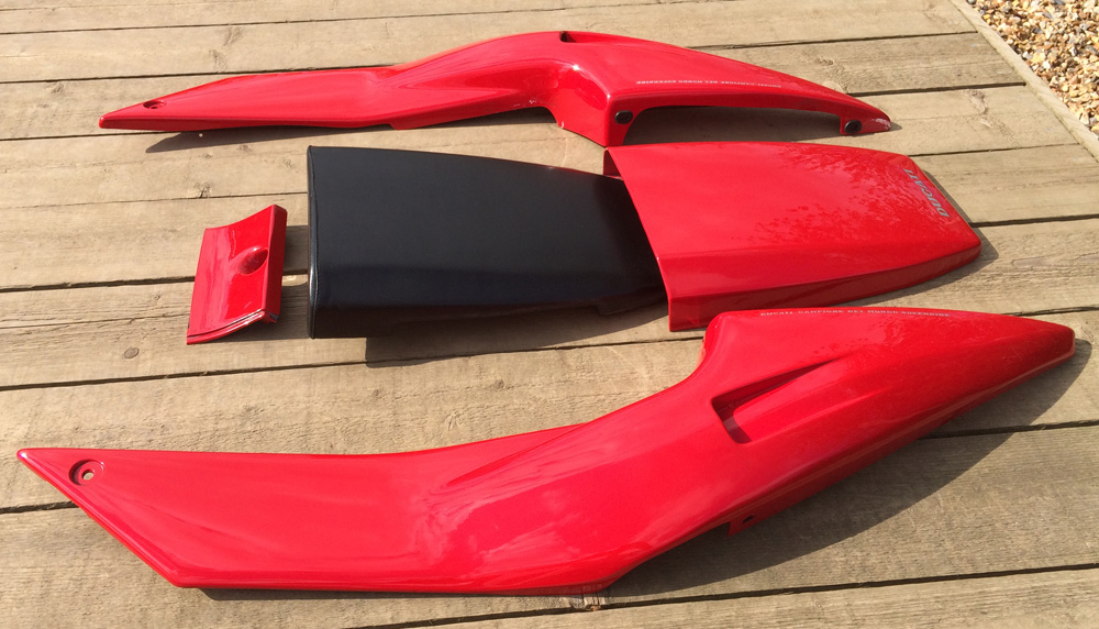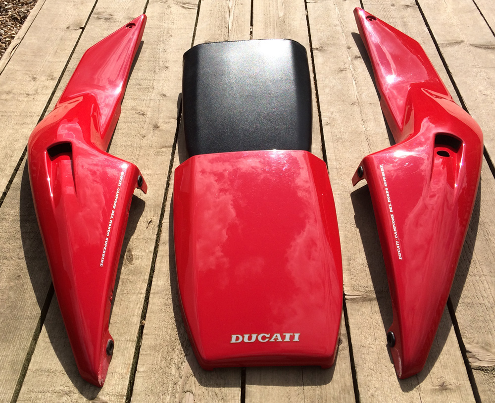 All the parts necessary to give your 888 Strada a refresh, put it back to original spec, or convert your SP4/5 to a practical sports tourer ;-) Removed from my 94 Strada around 97/8 and stored wrapped in the loft. All in excellent condition. Available are: Complete seat unit both seat pads Rear seat cover Both side panels Seat lock panel Front mudguard Complete exhaust system Original Ducati silencers Headers, originally polished by me, wouldn't take much to get these looking good Rider and pillion footpegs with rear brake microswitch I'm open to sensible offers before I split it all and place on eBay. Nick