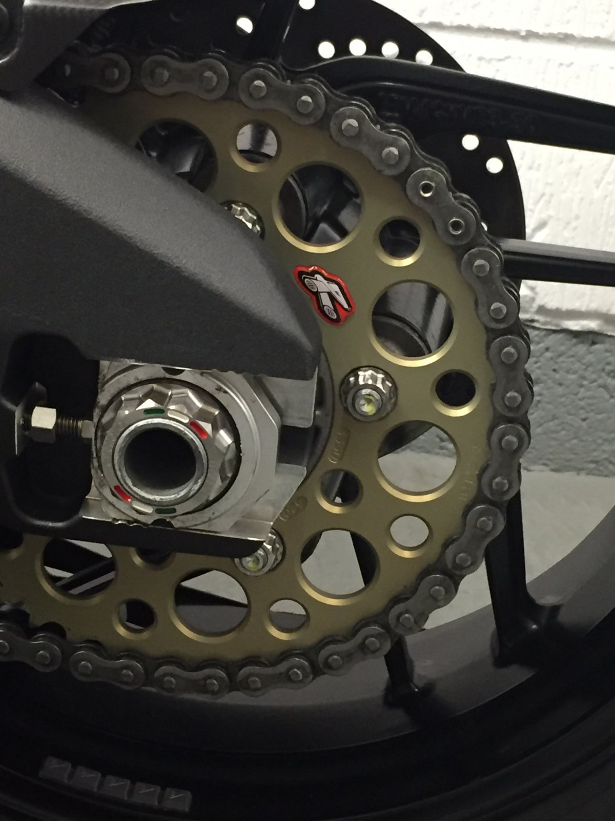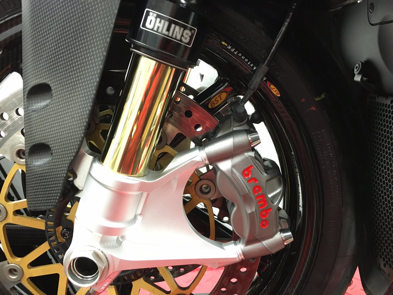 Brembo Supersport discs fitted. 330mm and the correct disc friction surface depth for the M50s. Needed 5mm spacers and longer caliper bolts....took the opportunity to put some titanium disc bolts on....totally not necessary but they look nice... All the right bits in the right places now..
