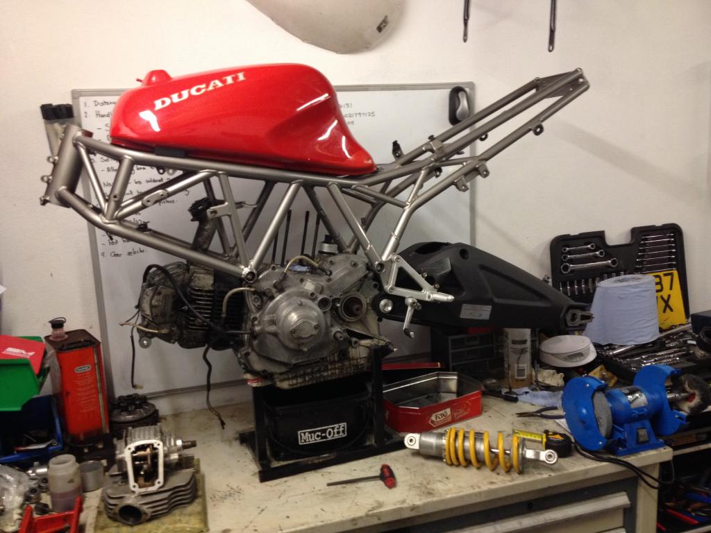 Howdo!! Always wanted a cafe style racer, used to love the look of the old Triton's and having seen the Norton cafe racer (Nicest bike at the NEC IMHO ) I've decided to cobble together all the bits I have been collecting. 900SS engine (Cheers Imola) currently stripping down then painting. 900 I.E frame (Cheers Gillan), monster 696 swingarm, carby tank (Would love a Norton style tank....maybe later???) Radical seat, stubby end cans with either monster headlight or V-rod. Cheers Pablo