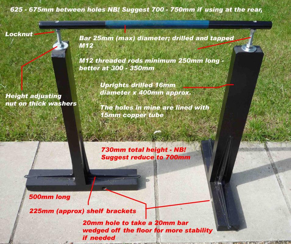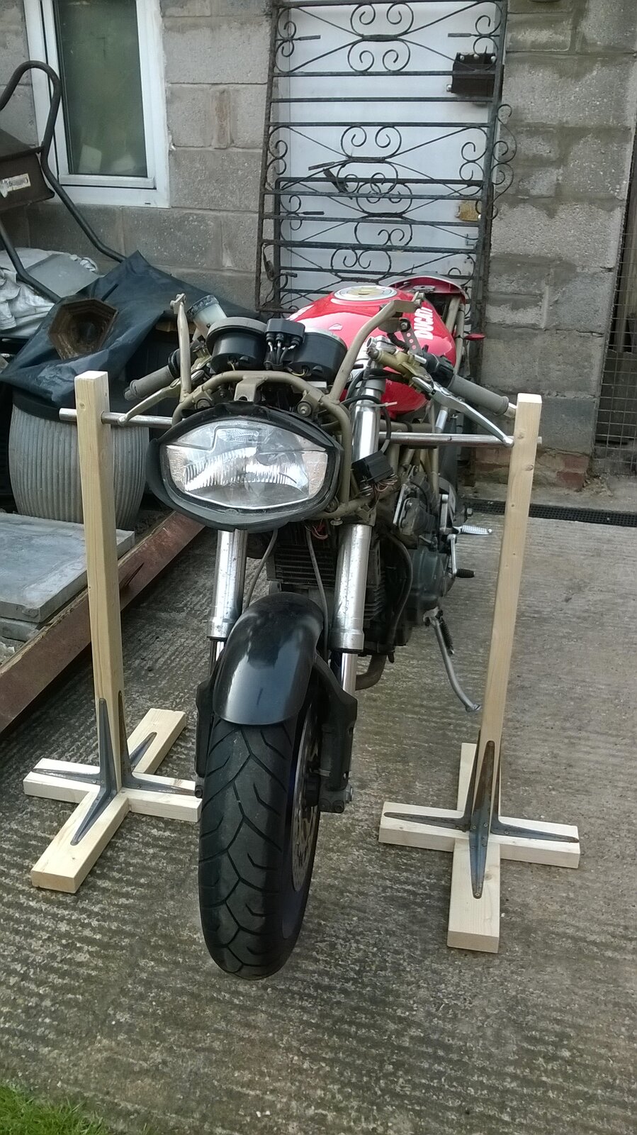 various ways to suspend the front of the bike probably easiest way is is al's licenced stands with a bar through the frame at the headstock first 2 pics curtesy of al last pic is my effort