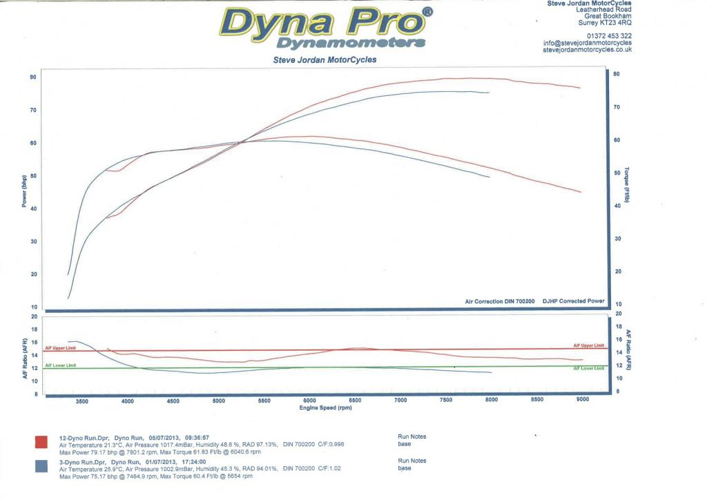 After the bike dumping it fuel tank over my engine twice in the last month I ended up replacing the float seats, needles and mixture screws on the flatslides. I decided enough was enough and booked the bike ito a rolling road setup at steve Jordan motorcycles in Great bookham. Yesterday I went to pick her up. Steve had to wait for main jets to arrive, gone are the days of the dyno station with draws and draws of flatslide jets of all shapes and sizes. He changed the main jet to a 150 and set the float height to 12mm. I haven't checked what the mixture screw was set at but one thing is certain compared to what it was like before it pulls like a train and also there is a noticeably different bark to the exhaust not, its so much more crisp and sharp. The mission now is to make the spaghetti system sit level as one of the end cans is currently on the piss and sits higher than the other. I t doesn't help that the carbon hangers were made by stevie Wonder whilst on holiday in italy - they're proper shite, and not even trimmed up evenly! A real joke, but somehow I don't think that I'll be able to get hold of the stainless hangers that the pipes also came with back in the day. I'm going to have to undo all the springs and see if I can re-align it so that the cans sit true and not melt my left hand indicator! View attachment 17441