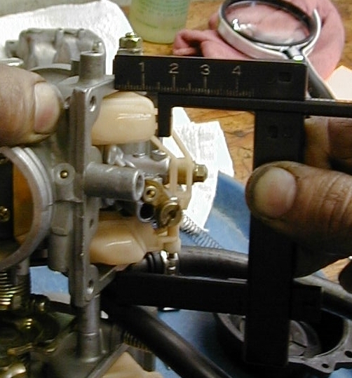 Found the photo I was looking for.....funnily enough on this forum. Get two cards and cut them both identical so the legs are straight and will sit across the float assembly without touching it and the bottom of the legs sit on the gasket face. Take a third card and trim two pieces the same size as the legs but full height. They go between the other two cards as spacers so there is a gap between the middle of the two shaped cards. Stick the legs and spacers all together....supaglue worked on mine. Cut another piece off the third card and slide it between, if it all fits nicely then mark it in mm. The photo shows it reading 9mm float height. .