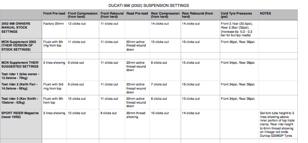 The 2002 998's been around for 14 years now, so most owners may be dab-hands at understanding their bikes suspension. However, I hope the following can be useful to anyone looking to adjust their suspension setup. The info includes "2002 998 Stock settings, and "Suggestions" from a couple of SPORT BIKE Magazine Test Riders. Info has been compiled from great threads such as http://ducatiforum.co.uk/threads/998-suspension-set-up.37913/ from @Cream_Revenge . And Suggested Sport Bike Motorcycle Suspension Settings | Sport Rider and the 2002 Owners Manual. Just a bit easier format to view and compare. Please find in PDF and JPG formats. Cheers, Al