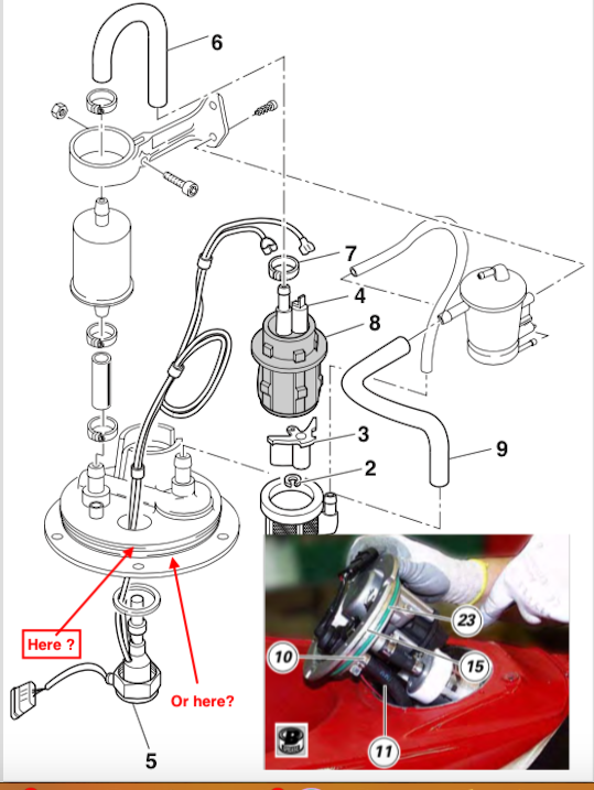It was/is a wet day here so I've been in the shed fiddling around with the bike to a) see if I can find out what's causing the misfire and b) to fit a couple of parts I bought - might as well do them at the same time whilst it's in pieces. I managed to find a set of 50mm CF Termis which arrived last week, readers will recall the bike has 45mm titanium Termis which had been pushed inside the 50mm exhaust pipes - by the supplying Ducati dealer I may add. I couldn't find a titanium 50mm set so settled for the carbon fibre ones. They just need a bit of a polish that's all. I also bought a monoposto subframe so the plan was to fit that as well. However, the bike has an alarm and the fitter ran part of the alarm loom through the subframe and not behind it . It's the piece wrapped in black insulating tape. I can see why he did that as there's part of the bike's loom run through there as well plus there's a rubber band to hold it in place. The problem is Ducati thought about it and put a connector there which allows the loom to be broken and passed through the subframe; the alarm fitter didn't think about it . The only way to get that out of there so the subframe can be removed is to cut it and guess what? all the wires inside the tape are black. No monoposto subframe today then. Time to reassemble everything and move onto the original job which was to replace the fuel filter. Tank off, fuel drained, pump assembly out and check it over. With the exception the filter is dated 17.02.04 all is good in there, all the pipes are in good nick. Old filter out, fuel pump out as well and check the gauze filter underneath, not too bad (apologies for the blurry picture of that one) just a tiny bit of what looked like fluff, otherwise good. Clean the pump pick up filter, replace the fuel filter with a new one dated 10.01.20 and reassemble the assembly. Now for reassembly back in the tank tomorrow morning. A question though. Should the large green O-ring sit on the bottom of the fuel pump flange where the no.15 is in the colour photo below, or should it sit on the shoulder above that, where the no.23 is in the photo? I can't remember what I did when I replaced the fuel filter on the 748 last year but what I do know is that when I first reassembled the 748 tank and filled it with fuel it pissed out all over the engine as I'd nicked the o-ring putting it back together. Just in case I ordered two this time round .