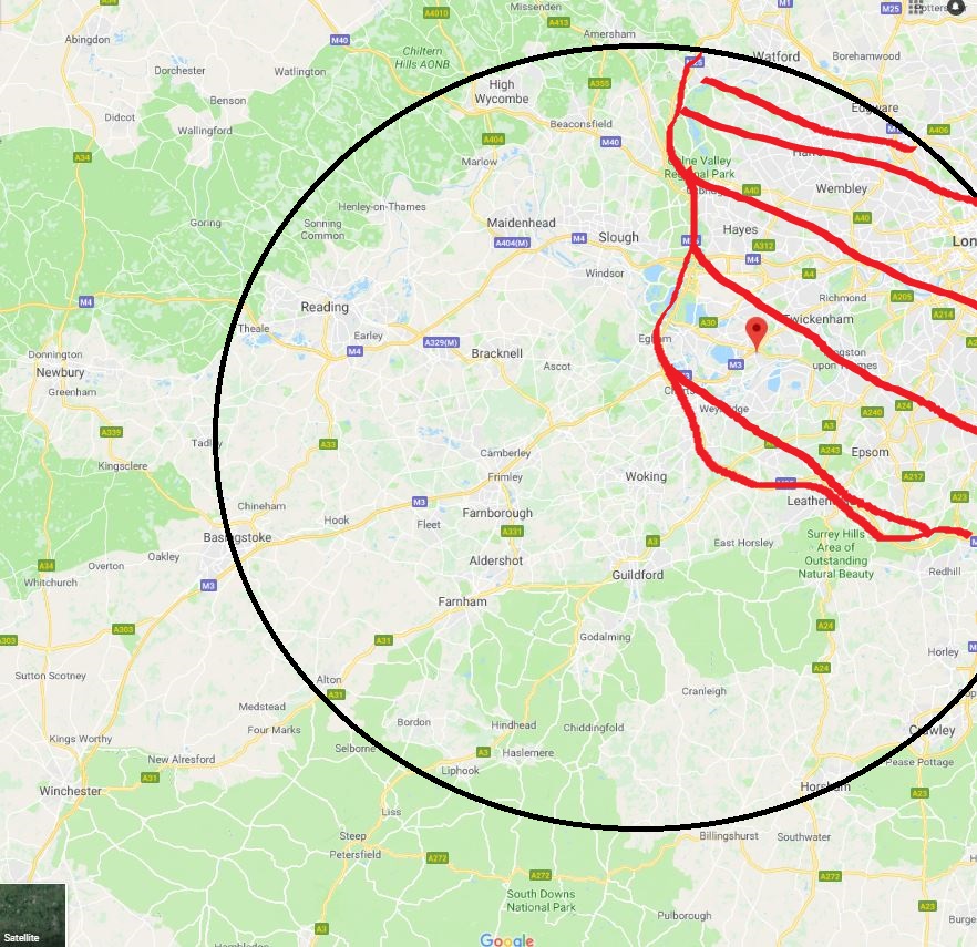 Sunbury is where the BP research facility is, I recall. not a bad place if that is where you are heading. things to look out for; will your employer have a secure area to park and chain up a motorbike will you be ok not being too close to a train station (as Nasher points out, being near a commuter station to London will push prices up a lot) the screenshot below has an approx 50km radius from Sunbury with the red shaded area being "inside the M25" where only evil lurks ;-) (but seriously, the prices within M25 are again usually very high for poor standard of accommodation) Guildford, Godalming and nearby have historically been thought to be amongst the most expensive places for property outside central London (we have an office down there, so I've been plenty of times and have colleagues commuting horrendous journeys so as to be able to afford a home) I am sure there will be plenty of southerners along to help, as you mention, motorcyclists (and especially the bunch on here) are a decent lot. picture courtesy of google maps and my shonky artwork on MS Paint. Pete