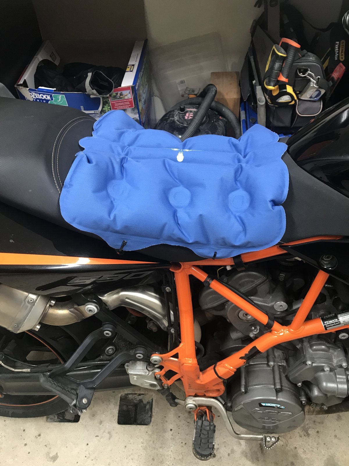 Had the exact same seat on my KTM , it popped unfortunately , though it was good whilst it lasted. Not as good as the airhawk though as the small connections that run between the bladders on the airhawk allow it to be used with a lot less pressure so you are not as raised as the other air seat variants. You get what you pay for , its not just a balloon It's also perfect to sit on when you are watching the racing too