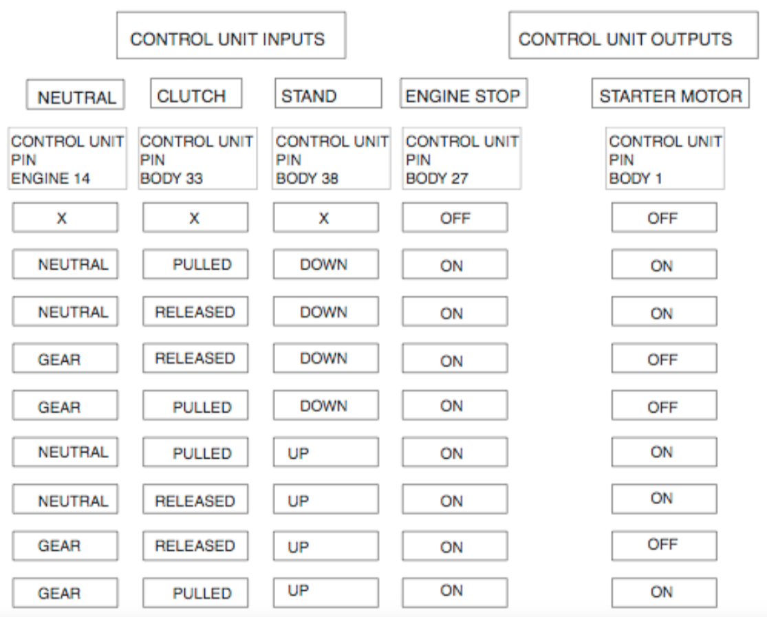5. Not correct. The red/white wire to the starter solenoid is ignition switched 12V. The red/black wire to the solenoid provides a ground energising the solenoid when the button is pressed. This ground is provided by the ECU as long as the conditions with regard to neutral, side stand and clutch switch are met.