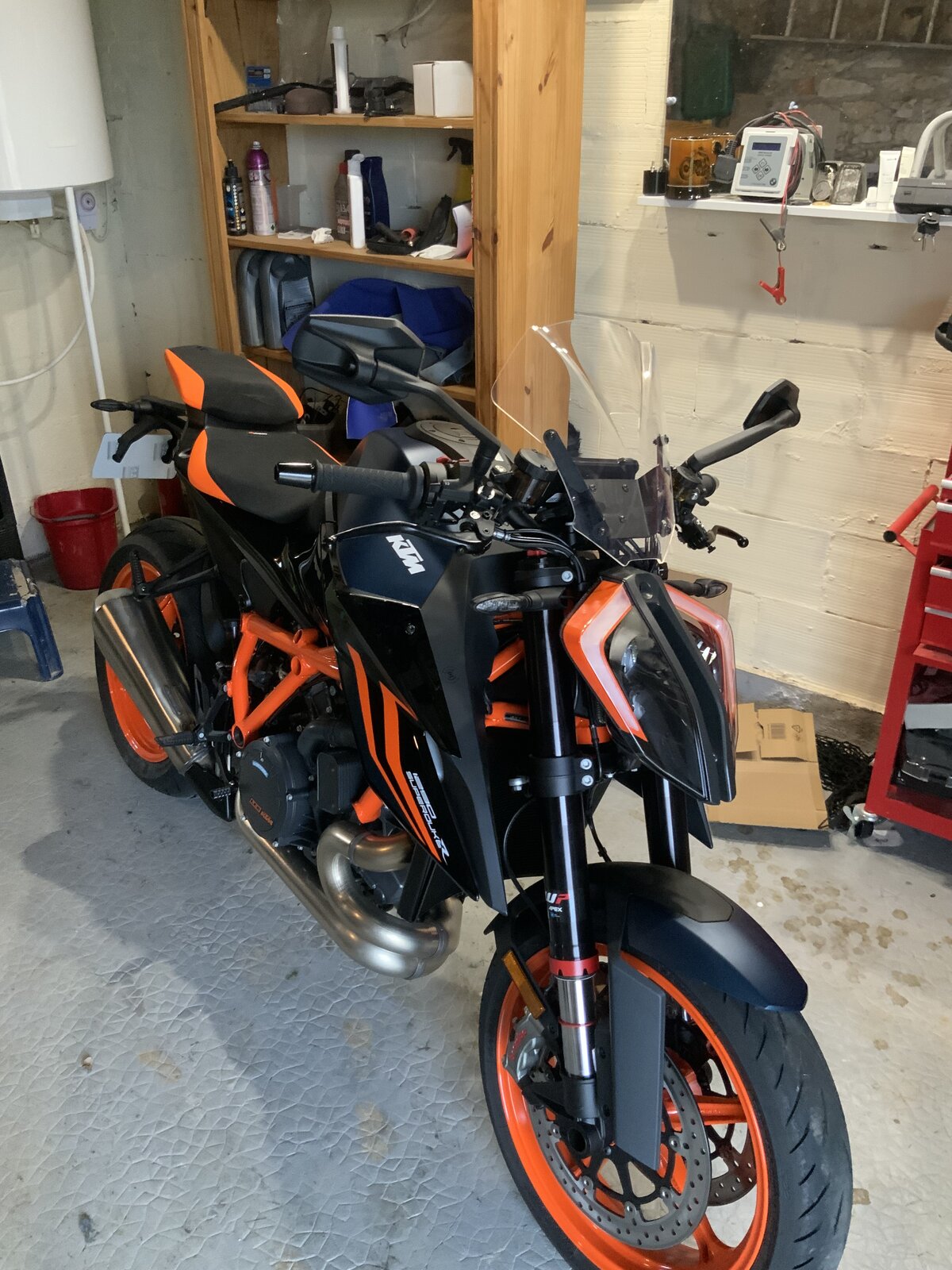 Not wanting to hijack @carson thread any more than I have…my 1290 R (carson checks garage..lol) Just collected today, moved the bars back, position feels spot on. MRA screen installed, gone for clear. Did not want to dominate the looks of the bike. Not tested yet, started to piss down the moment I tightened the last fixing! Used MRA before on an S1r and it worked great for removing a huge amount of air blast and not causing any buffeting. Will report back once this one is tested. Damp patches on the way back so steady away on the new tyres/bike. It already feels ‘just right’ though. Cant imagine anything more than a decent steering damper being added, if it has the usual KTM lively front end .