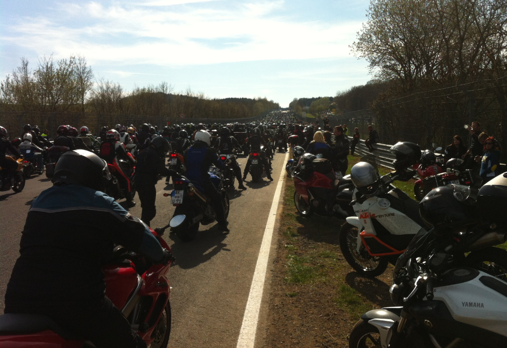 For those that don't want to mix it with cars. How about this, it is called Anlassen. Every year towards the start of the season they hold a bike only eventwhich dates back to when the track opened in 1927. Technically it is a religous thing where the two bishops (one catholic and the other christian) bless all the bikers in the hope that god will look after them on their travels. It is held on a sunday (april 22 this year) and the morning is usual tourist driving with the track open for all. BUT up at the GP circuit thousands of bikes are gathering and the streets are rammed with bike, sidecars, trikes, quads. There is Trade stands, demo rides and bands playing thruout the morning. I normally rock up with some mates and join the mass exodus waiting for Tourist driving to be suspended late lunchtime. Then the track is opened for the massed bikes quads etc to do a parade lap. Normally there is upto 20,000 bikes on the track doing the lap. Previously we have blatted thru the traffic to finish the lap then hurry on back to the GP track to knock out another lap. All this is free. It is an absolute, as you'd expect there are sportsbikes, customs, many of the Enduro bikes and quads are doing most of the lap on the back wheel. The pic is the queue to get off the track. Normally it takes an hour or more for everyone to clear the track as it's each to there own so many just park up on the stright taking in the sights and sounds of the whole thing. The only time on the calender when all the cars have to shut the f%&k up and wait for the bikers to have their moment. It looks crazy and it is, We have 8 mates coming over to do this for the first time so the house is well and full and I'm sure it will get messy in the evening.