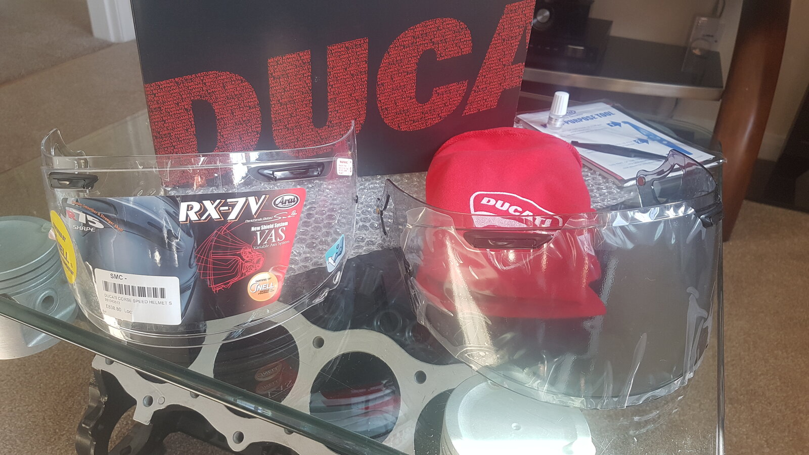6. im a bit confused how you managed to pay close to £950.00 pounds for this Arai Speed lid...when Onyabike and others are selling them NEW for £699.00, you get a clear and light smoke Visor with RX-7V lids anyway and a dark tint is £65.00...Unless you are throwing in the coffee table it's sitting on as well I don't think it's much of a bargain????