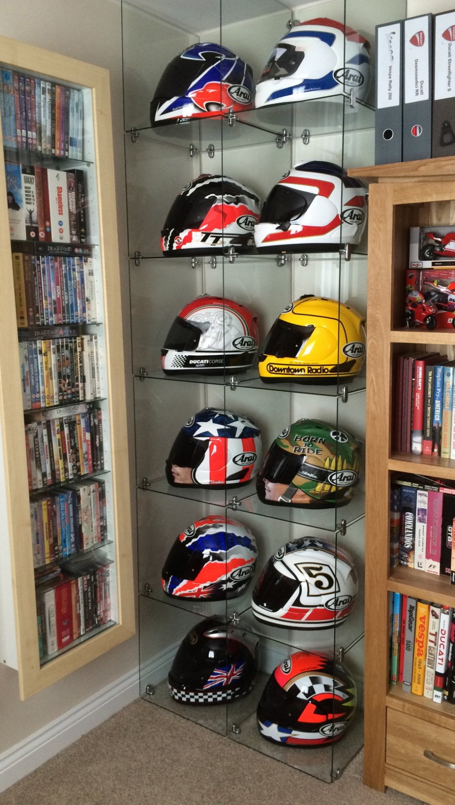 They look great, you've done a few quid on lids and I'm sure you're very happy living in arai land......I would never have changed, but now I have I'm not sure I'll return to the arai fold. Each to his own and your collection does look great, just some of the other manufacturers are making good helmets...... And it's always good to make a few 'wibble' noises