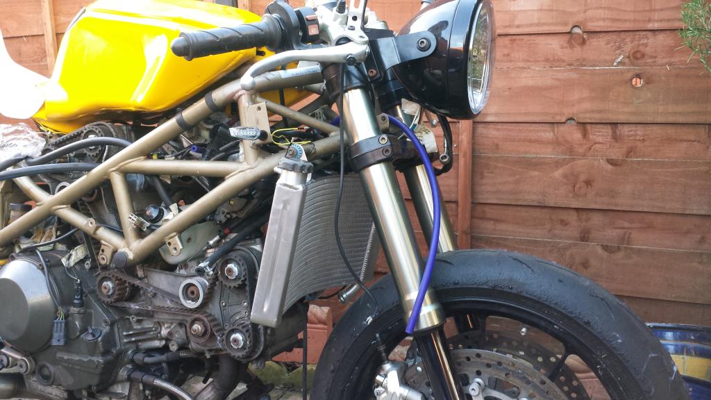 I'm not sure why you can't see my pictures, they are hosted on photobucket. Well i trial fitted the new rad, it's near as damn it perfect! I have also finalised the location of the front indicators (I just need to trim the plate they are fitted to down). The rear light is wired in and working perfectly too. It's coming together now, I still have the monumental job (for me anyway) of shortening and tucking away the loom, it scares me tbh...