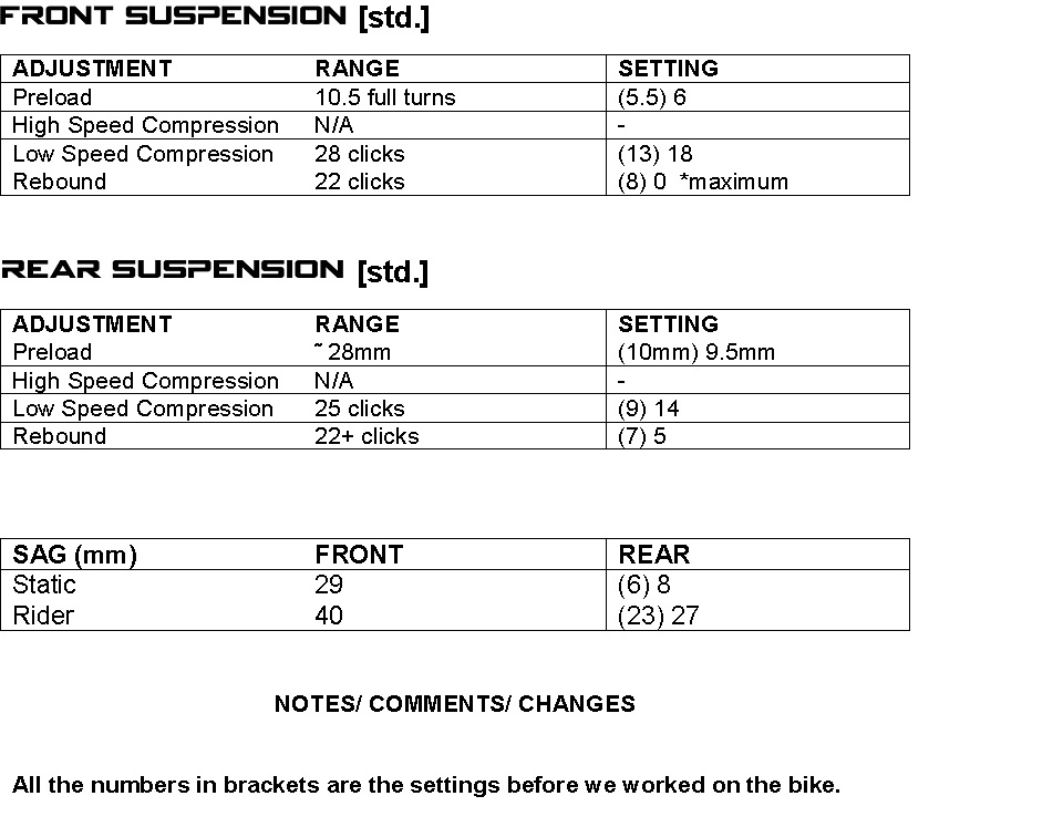 Glad it semi worked for you, to be honest the rear compliance was what I was really after, the front is fine for me, I took it around silverstone when I had it done and had no problems at all with feel.. mind you it's quite a confidence inspiring bike anyway... keep us posted on what you get doen to the front :thumbsup: