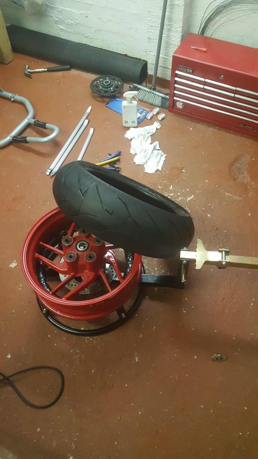 Happy to report no tools got wanged!!! In the end i stumped up for one of those £38 bead breaker/tyre changer as mentioned earlier in the thread, the rim rested on the spokes on it so as not to damge the wheel i added a little padding Which did the trick, the bead broke without too much trouble and i had the tyre off in a matter of minutes, a top tip is lube the crap out of it and make sure its warm! I also purchased a static balancer, which i am still awaiting delivery so havent yet put the tyre back on, i shall let you know how that bit goes! Even with the purchase of new tools (which, lets face it, is always fun) i have still saved just shy of £30 from having them supplied and fitted at a dealer, so any future changes will save even more.....and acquired a new skill to boot!