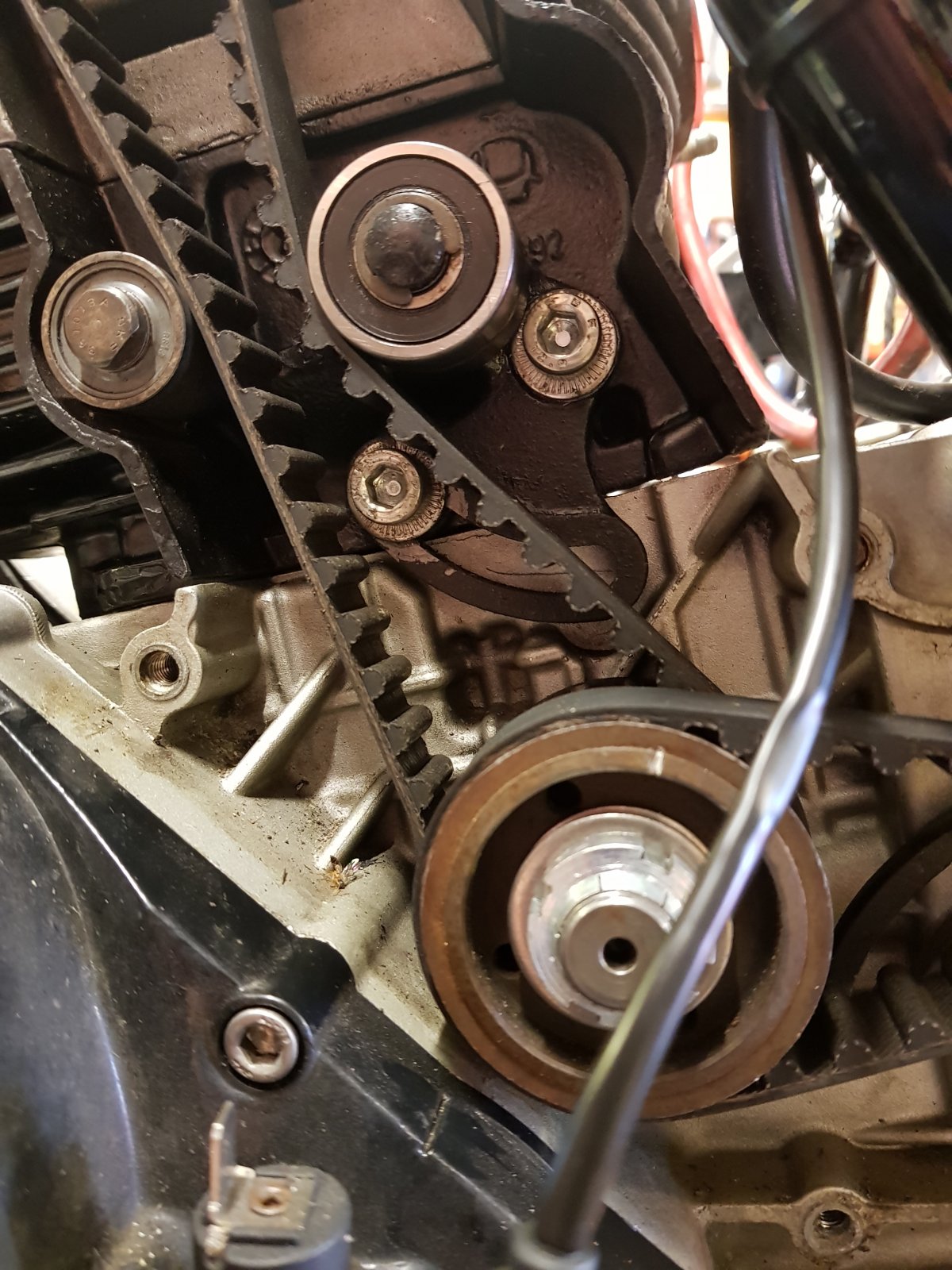 Can someone post a pic of 900 tensioner arrangement? I'm not convinced I have the correct ones. Belts definitely slack on full adjustment. I do not believe this is due to lack of base gaskets alone.