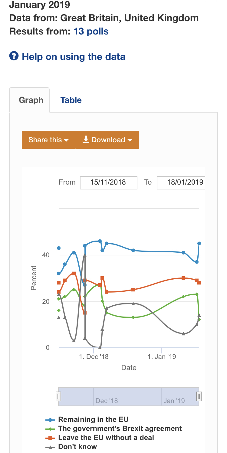Sorry Dudes ... been busy working. What really matters right now (for Wednesday) is MP opinion, not public opinion, not your opinion, nor mine. Parliament (thankfully) appears to be massively against "No Deal" - that even includes the majority of the ERG. If Parliament decides we should have a "Peoples Vote" then public opinion will be what matters. Where is the poll-of-polls that suggests public opinion has swung in favour of "No Deal" ? I did a quick scan but couldn't see a link above.
