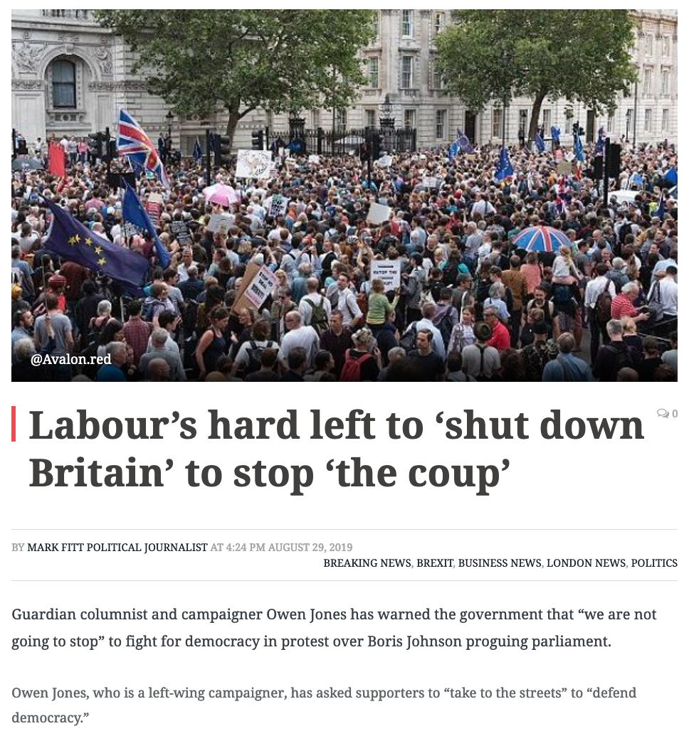 Ironic because it's been the left wing & MSN citing there would be civil disobedience by 'the plebs' who voted leave when the eventual horrors of brexit truly take form, and also thoroughly disingenuous because this lot aren't protesting about the proguing, they're protesting because it might actually get brexit done, one way or another. . the straw that broke the camels back i think its the words of the Gov and press that are coming back to haunt them. the vast majority of the press is pro brexit, over 80% by readership. you cant deny the language they use to describe most remain voters, much of which is reproduced on here. and you cant deny it's human nature to fight back. as you see reproduced on here. . on another question a few years back i never visited an alternative website before the vote, i didnt trust them. all my info was gathered from traditional sources, it was their language that pushed me to Yes. and its their language since that has kept me firmly there.