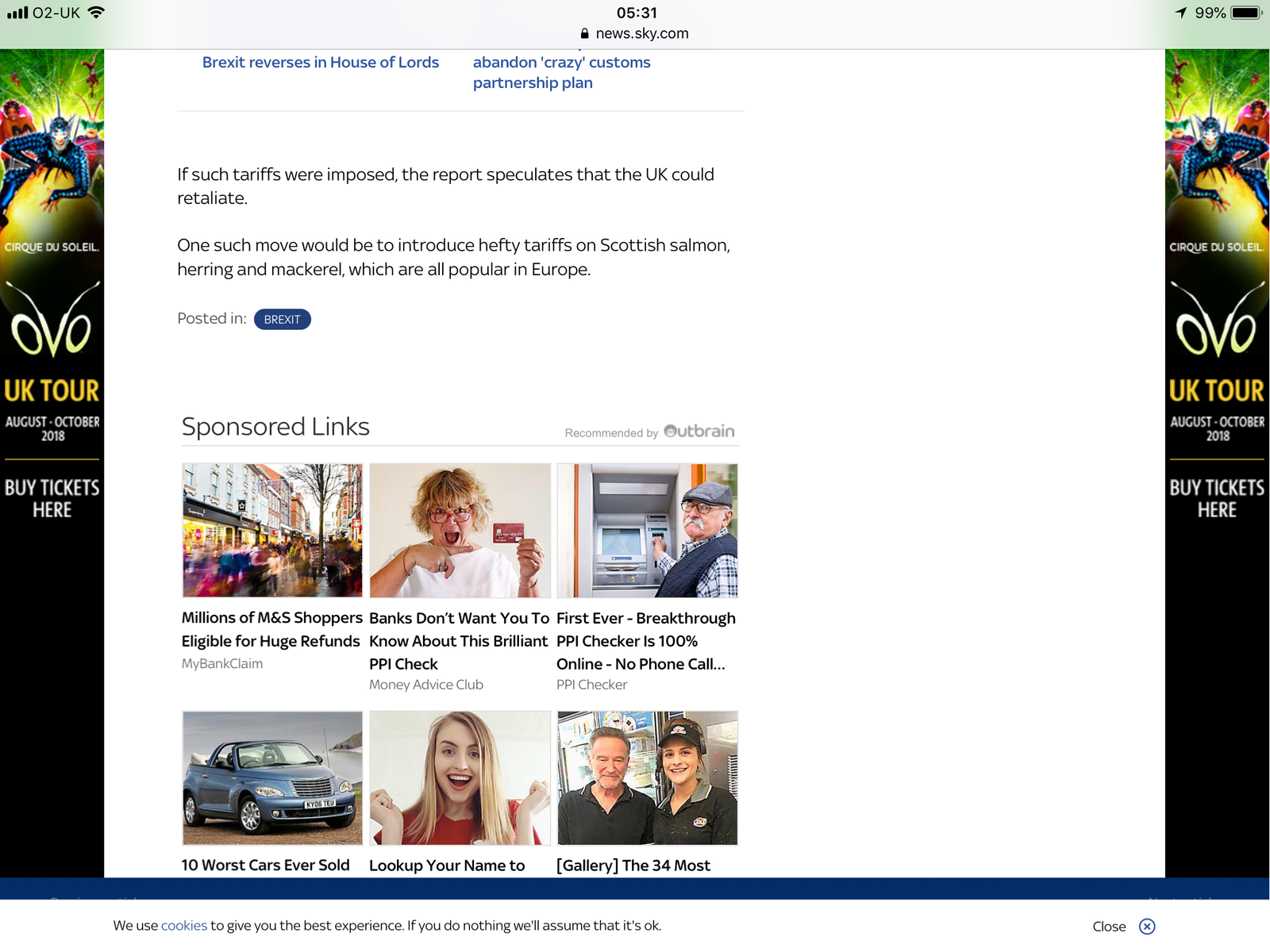 Unfortunately project undermine knows that a lot of people won't bother considering looking for that nugget of information. They'll simply see that Brexit is supposedly ruining Fish and Chips And nor will they pick up on the Web page layout and the fact that the following and final statement: "If such tariffs were imposed, the report speculates that the UK could retaliate. One such move would be to introduce hefty tariffs on Scottish salmon, herring and mackerel, which are all popular in Europe." Is positioned past a table of other Brexit links and sandwiched between those and a bunch of PPI adverts, conveniently the least viewed section on any web page, which anyone who uses Google analytics will be able to tell you, and Sky will abolsutely know that as well the sly buggers
