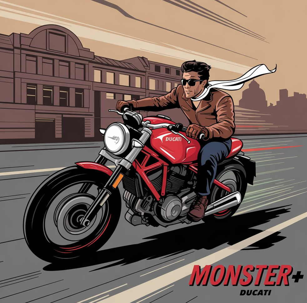 I just asked for a "Ducati Monster + image ridden fast by a man in a 1930's artistic style giving a sense of speed" and got this and this one, couldn't convince it to lose the trellis frame, but it cost me nothing and it took 2 minutes, so no real complaints from me.