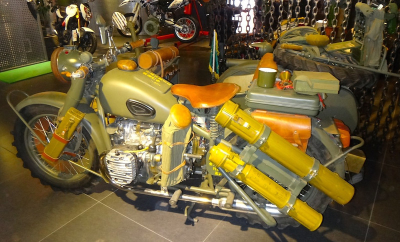 Heading back to Beijing checking out a new bike shop, all tarted up and fully farkled Chang-Jiang 750 sidecar (China 1938 BMW R71 copy) on display....