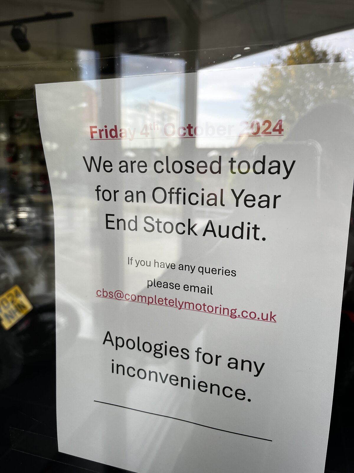 Both stores have the same bullshit A4 sheet on the door like at Staverton. I spoke to another contact in the business and they told me that they’d known Completely were in trouble for some time, because there was a stop on their accounts with some parts suppliers. You only get that when you ain’t paying your bills. They also told me they couldn’t afford to run a BSB team but did anyway, and also that the owners were still driving around in Ferraris. And he tells me they’ve definitely gone bump, the stocktake is a half-truth, and nobody (in their opinion) are getting their deposits back. That boils my blood. I took a picture thru the Duc Worcs store window of a black Pani V2 with SOLD on it. I feel sorry for that person.