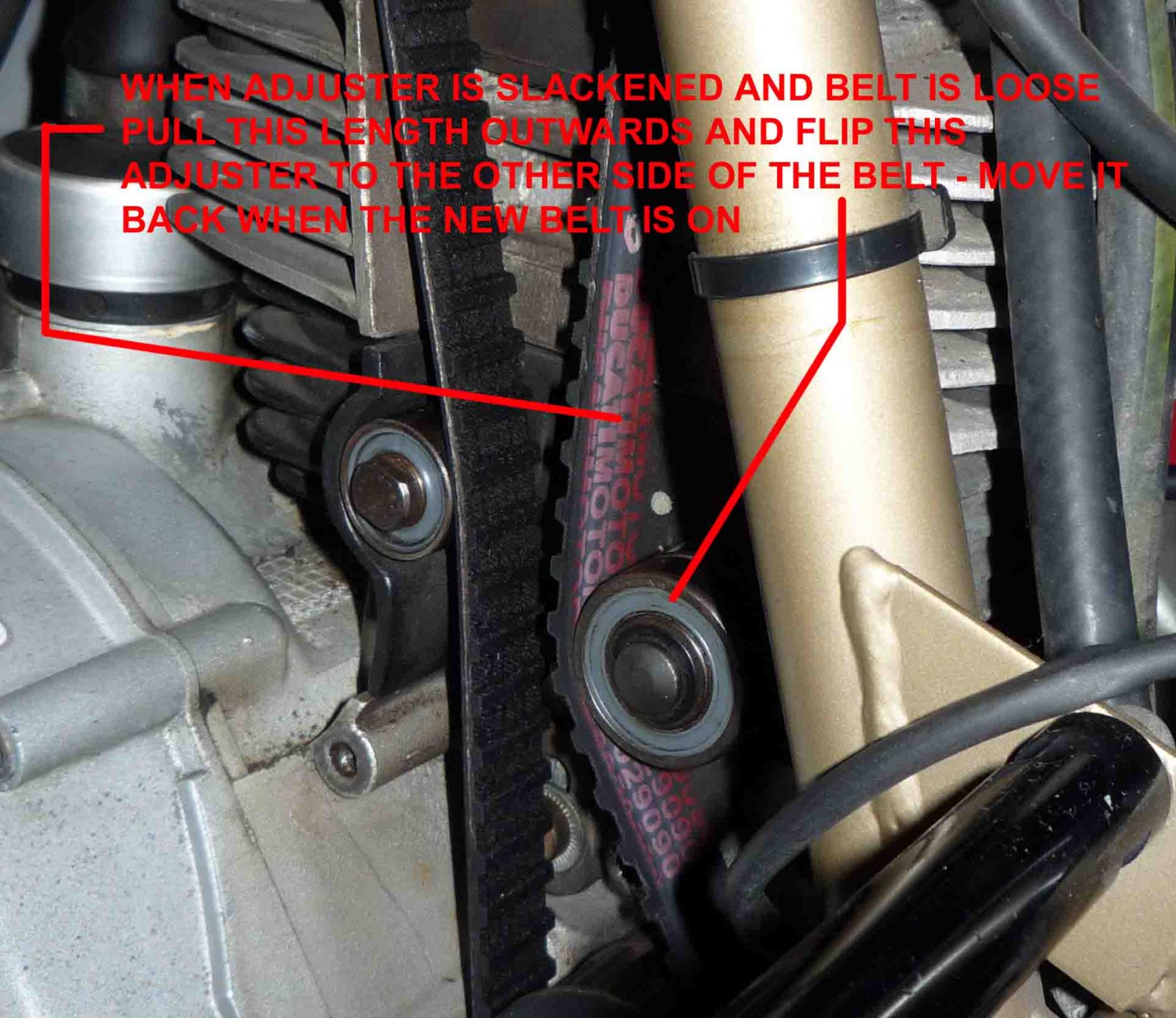 11. If the belt adjusters are slackened right off, pull the belt outwards where it's neaxt to the adjuster and then flip the adjuster to the other side of the belt......you should then be able to get the belts off easily.....