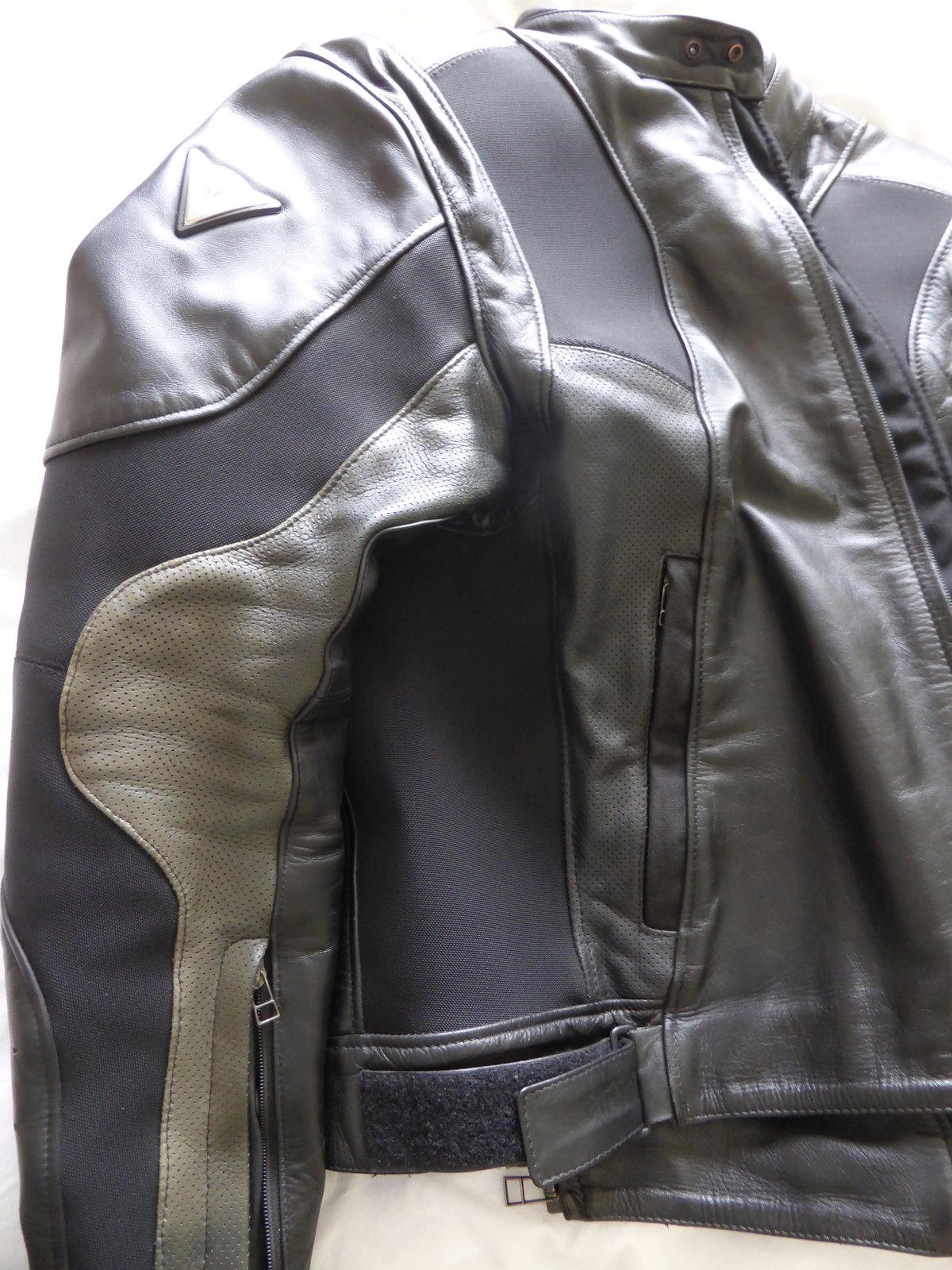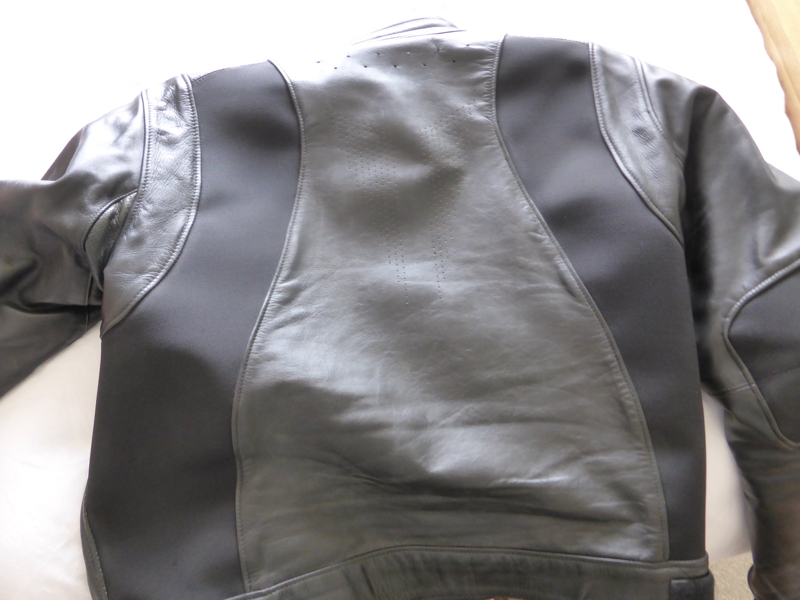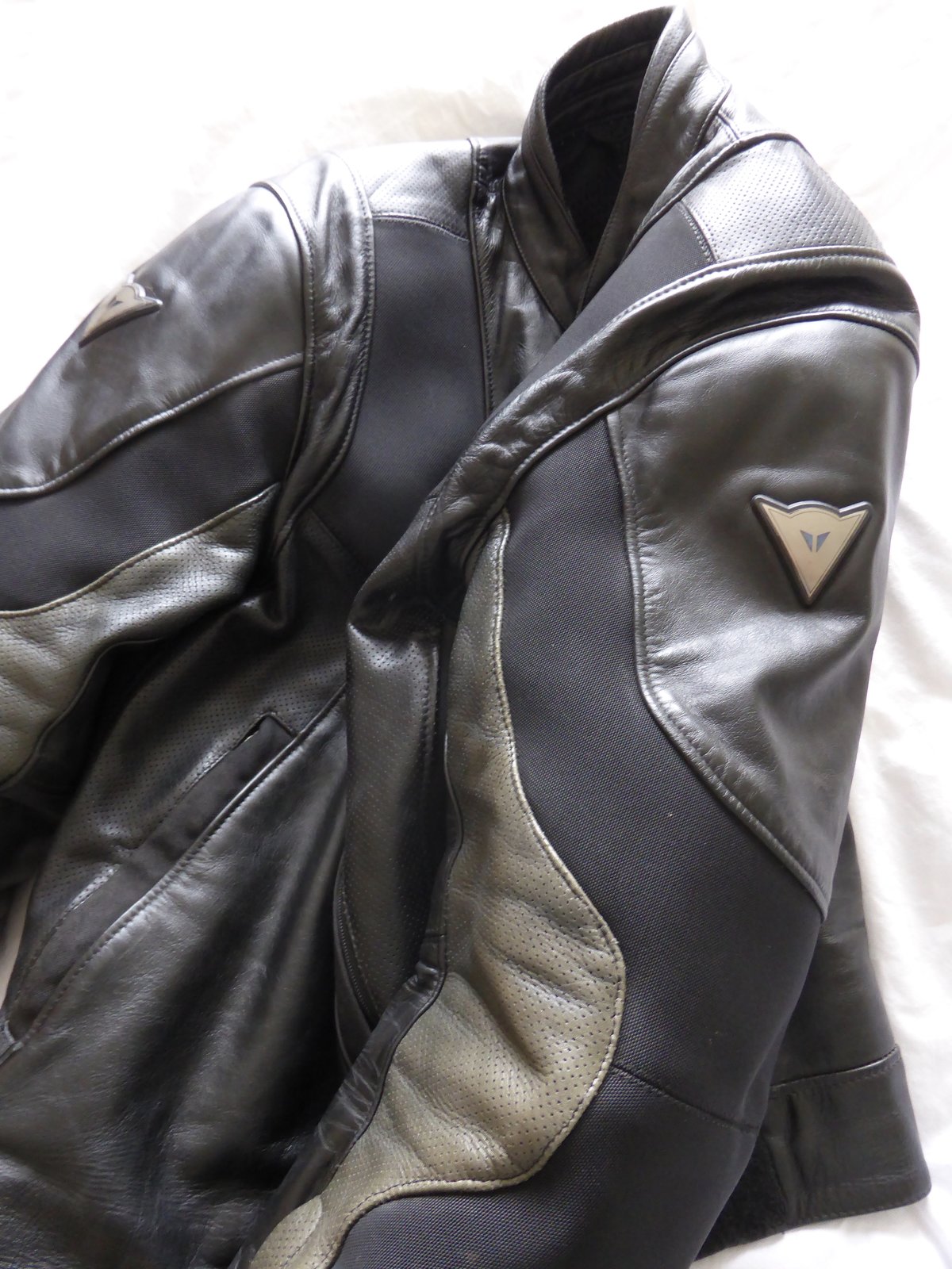 Dainese leather jacket, size 48, in black. It's more of a summer leather jacket, because it has tiny air flow 'holes' on the front, the back, and the sleeves. Indeed on the back, the air holes form the shape / pattern of the Dainese logo. Hope the photo's show that. It's also interspersed with fabric, making it more supple / comfortable. The quilted inner liner has never been worn. On the sleeves, the leather has discoloured, making it a kind of grey colour instead of black - but to be honest, I've quite liked it like that, so have never tried to take it back to black. It's only been used for summer riding, and each winter it has been 'fed' / treated with leather wax, so it is pretty supple now. It's a lovely jacket, but has rarely been worn for the last 3 or 4 years to be honest, as I always wear fabric. DId a trackway recently and found I needed a leather jacket - that's when I found it was too small / tight !! £75 + postage (can work out postage at point of sale via Hermes or someone like that)