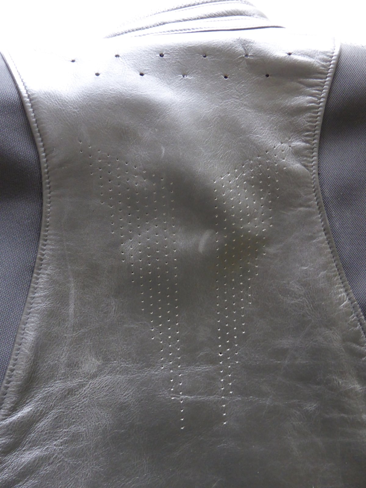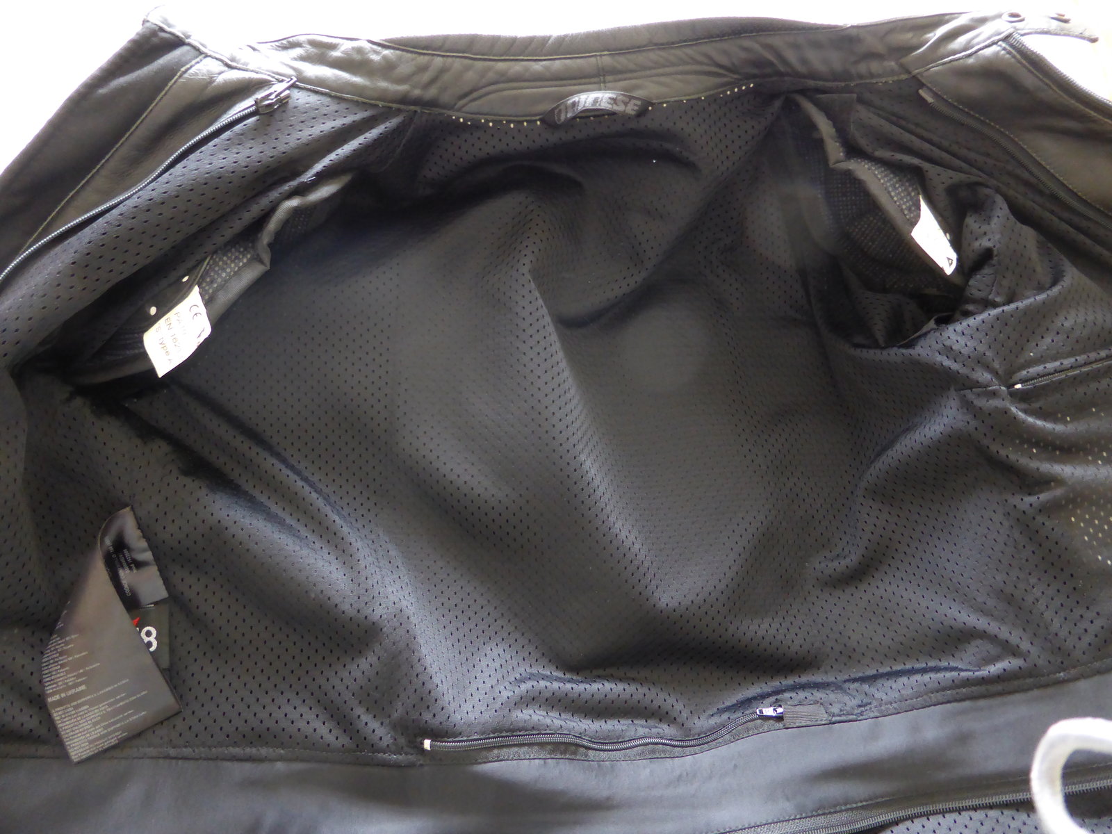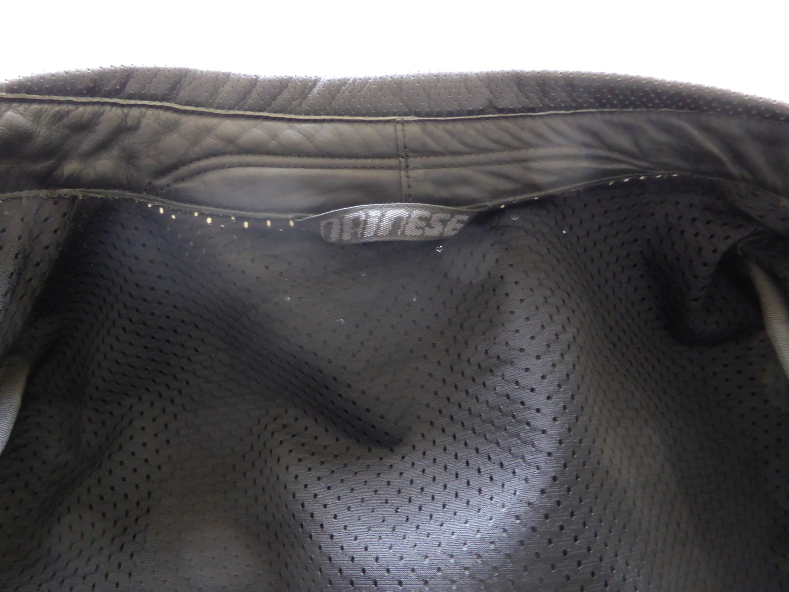 Dainese leather jacket, size 48, in black. It's more of a summer leather jacket, because it has tiny air flow 'holes' on the front, the back, and the sleeves. Indeed on the back, the air holes form the shape / pattern of the Dainese logo. Hope the photo's show that. It's also interspersed with fabric, making it more supple / comfortable. The quilted inner liner has never been worn. On the sleeves, the leather has discoloured, making it a kind of grey colour instead of black - but to be honest, I've quite liked it like that, so have never tried to take it back to black. It's only been used for summer riding, and each winter it has been 'fed' / treated with leather wax, so it is pretty supple now. It's a lovely jacket, but has rarely been worn for the last 3 or 4 years to be honest, as I always wear fabric. DId a trackway recently and found I needed a leather jacket - that's when I found it was too small / tight !! £75 + postage (can work out postage at point of sale via Hermes or someone like that)