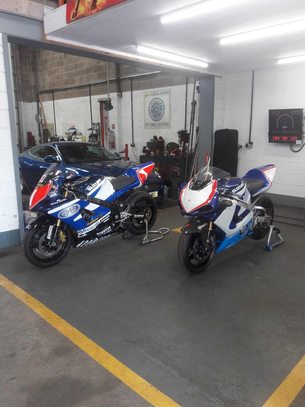 New fork seals, coolant being put in, new Pirelli tyres, oil and filter change and new front discs going on. (Original suzuki)