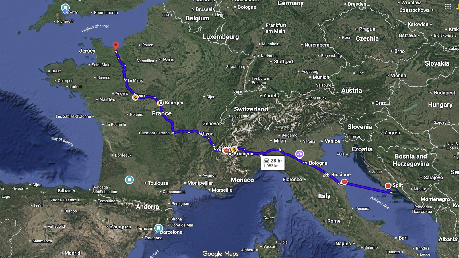 I've booked-up my ferry crossing from Split to Ancona so that I can spend a few days at WDW, and planned my three day route back to Blighty from Riccione to Caen for the ferry, stopping off overnight at Briançon and Bourges on the way.