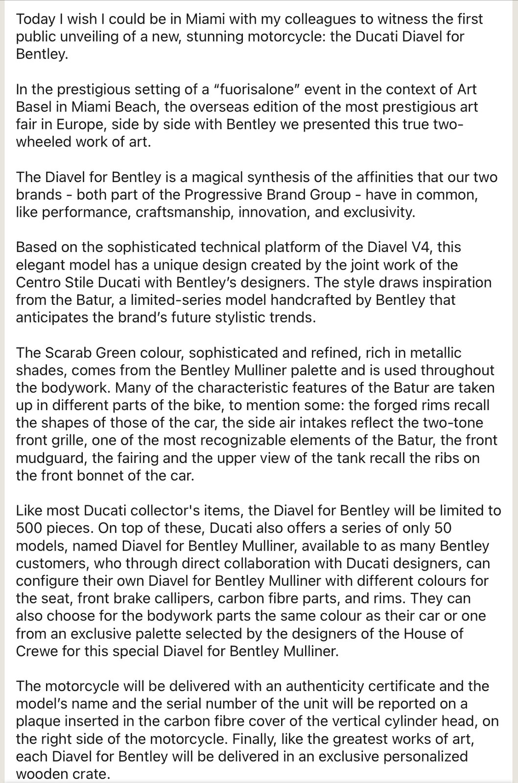 Agree, the original Diavel Lamborghini, in hindsight, was a bargain at only about £7k more than a standard 1260S. I thought with the SF Lamborghini Ducati said all buyers had to keep them for 2 years and dealers asked them to sign an agreement, that clearly didn’t work. I just can’t imagine ever seeing a Diavel Bentley on the road…