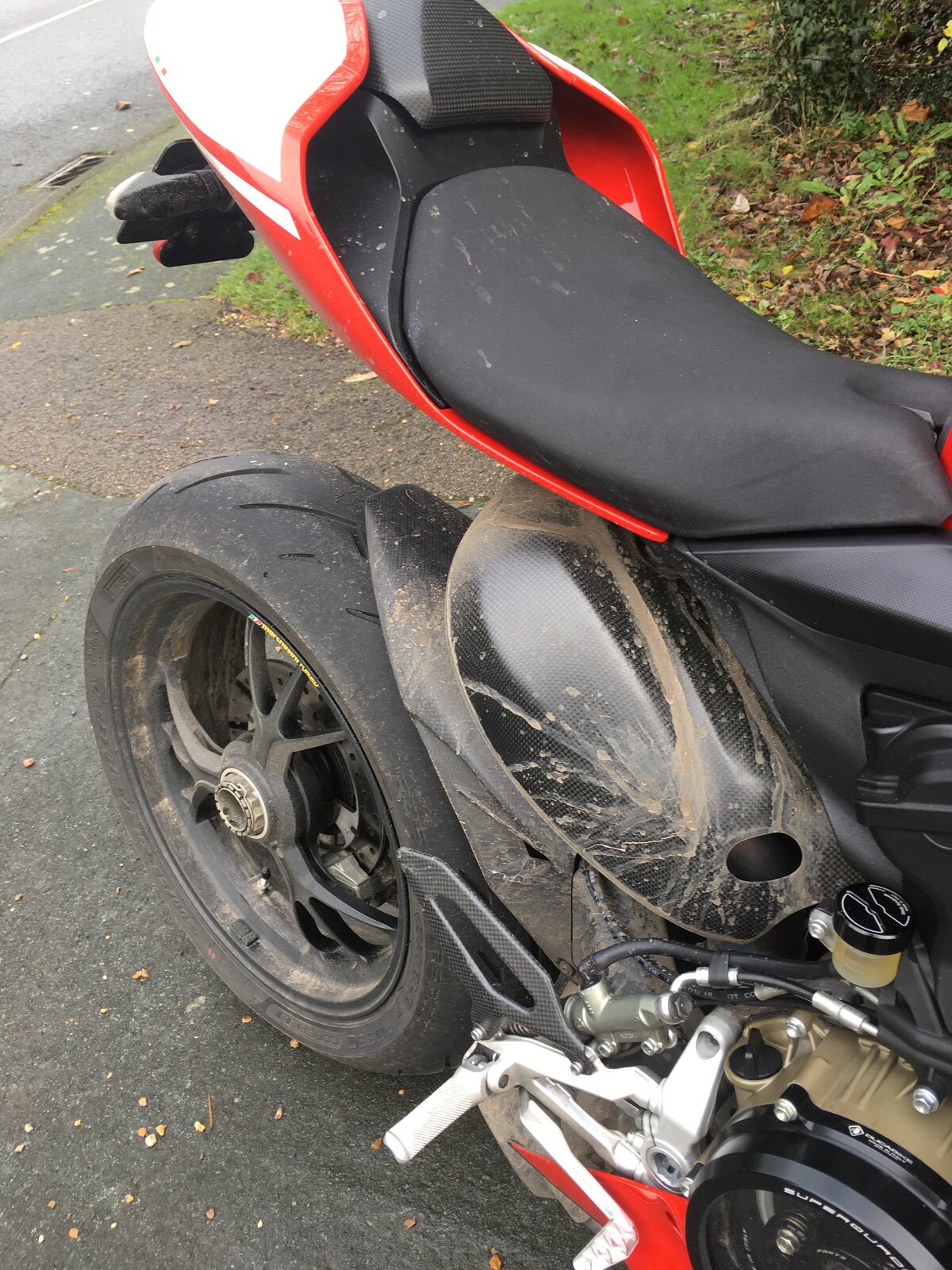That big thing sticking out the back onto which the mahoosive numbah plate is attached when the bike comes out of the show room does prevent a lot of rooster-tail muck from the back wheel from reaching the rider. Pannis and RSV4s have very small seat units… (Hope your recovery is going well, Richard!)