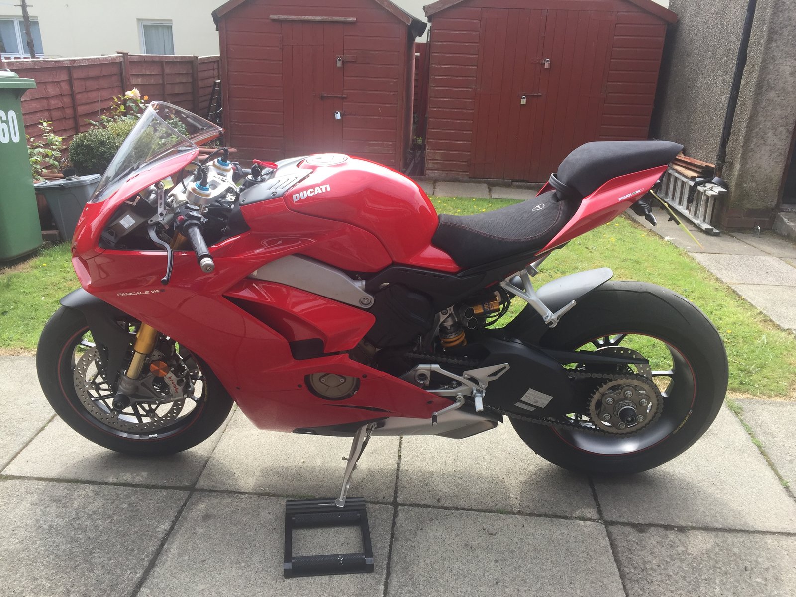 Hello. I've got a Sato Racing link on my 959, to drop the seat height, an 1199 seat to drop the seat height and I have a shortened re-welded side stand from an 1199 going on it. As I am Dani Pedrosa size. Has anyone else lowered their Panigale? Am trying to work out if I need to balance out the front end a bit. Handling seems ok so far. I understand there may be radiator clearance issues if I drop the front? My 959 is one of the Limited Edition ones, so has the DP brake guard, double bubble screen and underslung Akras. I've removed the quick release fuel cap, cos London innit. Don't want a match down the tank. Future plans are to put some R&G protection on it in case of a woopsie. Also have some special custom decals going on...