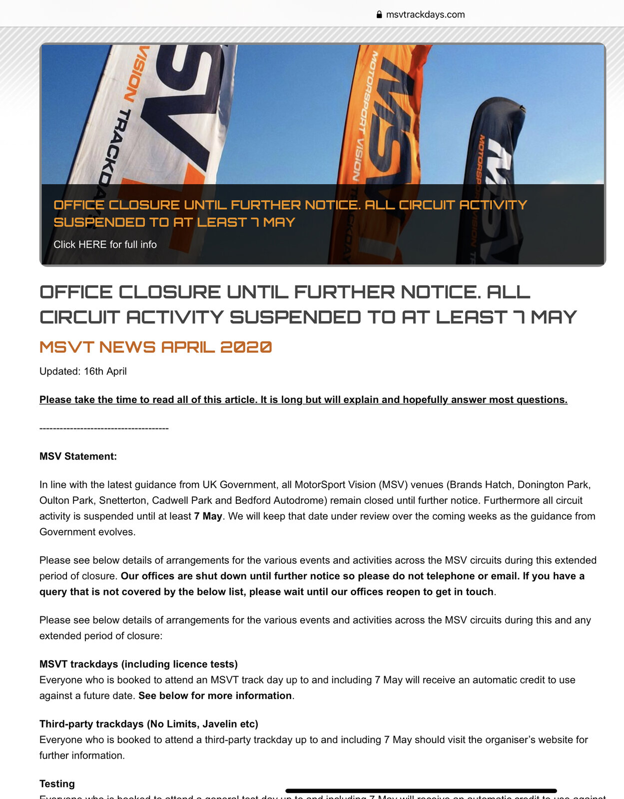 https://www.msvtrackdays.com/bike/news/2020/track-days-cancelled/ It’s getting closer to the Donington date - not looking hopeful that restrictions will be lifted in time.