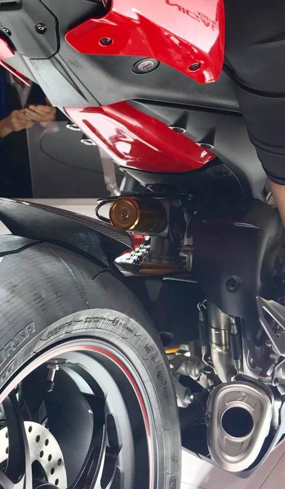 Exhaust pics. Definitely looks like two systems available/being produced. Race system for the Speciale and a full system for the S and Base models. This is the "stock" full system version for the S and Base. Race version is less bulky and uses a different smaller and more attractive heat shield and belly pan, it now seems clear. Photos courtesy of MR on Facebook. Rear quarter view of the Speciale shows the extra room the Race system allows around the rear swing arm due to different routeing of the pipes and a clear view of the smaller heatshield.