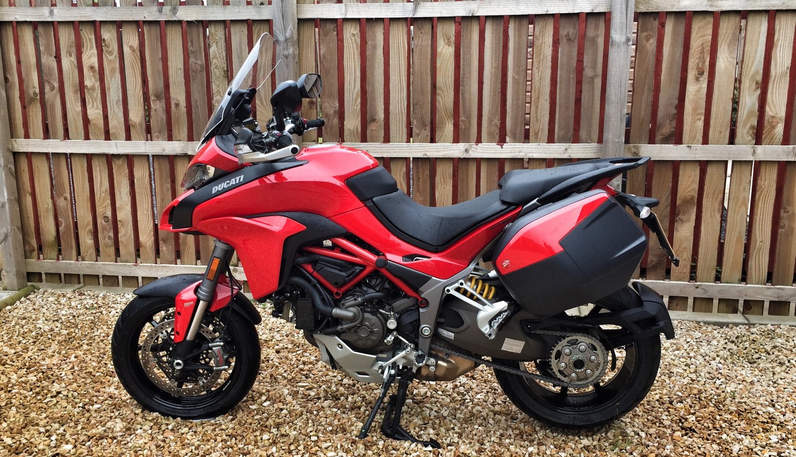 I was complaining already before I got the bike for small size (57l) of the side panniers. However after being now three weeks on the road I must admit that together with the top case we had two people enough clothes so that we washed only socks and few t-shirts during this whole time. The pannier liners are very handy but even having these fully packed there was left some extra space for a pair of trainers and phone chargers. Having red this thread earlier we've been very careful when mounting the panniers to the bike to avoid any damages. Using the extra space left over the liners meant that the panniers had to be mounted loaded. I found this actually making the mounting easier as the hardest part of this task proved to be bringing the pannier to the lock point after turning the key. One disturbing factor though is the 10kg limit per pannier plus the 180kph speed limit. Having been using Givi top cases for a while I chose to ignore the load limit and packed a hefty 18kg on it plus 12kg on each pannier. All cases seemed to have survived the load with no damage. I kept the speed under 180kph with only occasional bursts up to 200kph and at some point banged a 230kph when a group of 'cow' - read R1200GS- riders tried to contest me. I remember shifting down to 4th gear before I saw them fading on my mirrors in the horizon :Mooning: