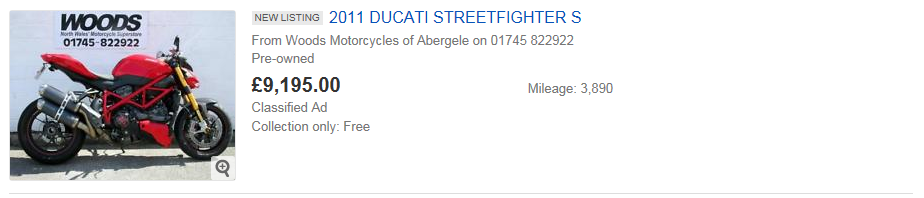2 x Streetfighter S on the bay at the minute... One which was listed by Woods, which appears to have been removed fairly quickly after listing? And a black one which looks like it may be @Cupid Stunt's old bike? http://www.ebay.co.uk/itm/2009-59-D...508049?hash=item3af17b8851:g:DSUAAOSw~jpZvumn