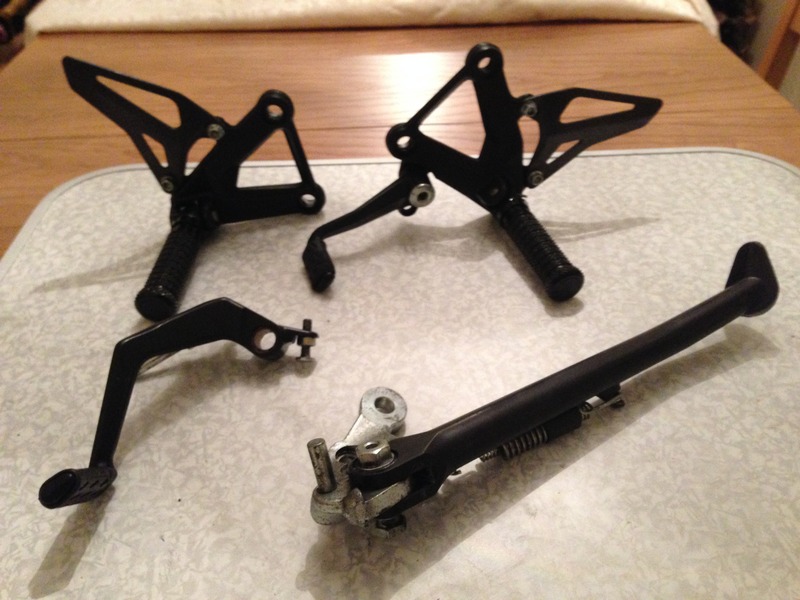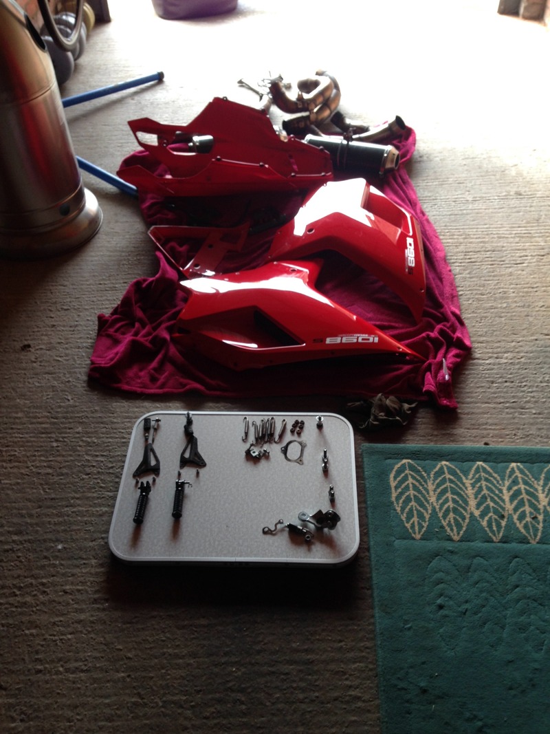 Time for a bit of an update, I fitted the Oberon clutch slave cylinder and the 14 tooth front sprocket, both have made a really big difference which is great. I've also fitted a R&G tail tidy, with some smaller indicators and a slightly 'ahem' small number plate! Currently my garage looks like this.... I have taken the exhaust off to get polished, the kick stand, rear brake lever, shift lever and both peg mounting brackets are off getting anodised black, I've also got a DP Carbon belly pan to fit. Whilst all the panels are off I'm giving it all a mega deep clean. Before all the panels go back on it's off to Baines Racing to have a belts service, the Ohlins rebuilt (again, as they weren't done long before I bought it) and then the suspension set up for me.