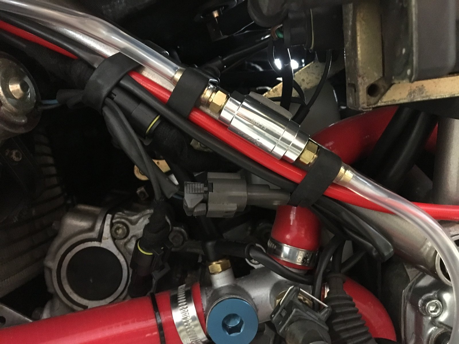 Fuel tank breather tube fitted. Foolishly tried to brim the tank and ride it without a 1way valve fitted. Major brown trouser moment as the overflow tube goes down to the belly pan and dumps any fuel right in front of the back wheel. So got a symtec one way breather ordered and fitted. Too big to go near the tank so fitted it next to the L/H coil. The in and out pressures on the valve were quite high. Easy enough to blow into the tank but impossible to suck out of it so notched a small piece of O ring out of the filler cap to let pressure out. Done about 5 or 600 miles with it fitted and seems ok. Then got my hands on some Ti Termis. Just thought they looked better on the Bayliss rep. Dicked about with the exhaust can hangers for ages trying to get the height right but couldn’t. Looked a bit odd so ended up chopping the exhaust hanger down to lift the cans. Looks miles better with the cans tucked up.