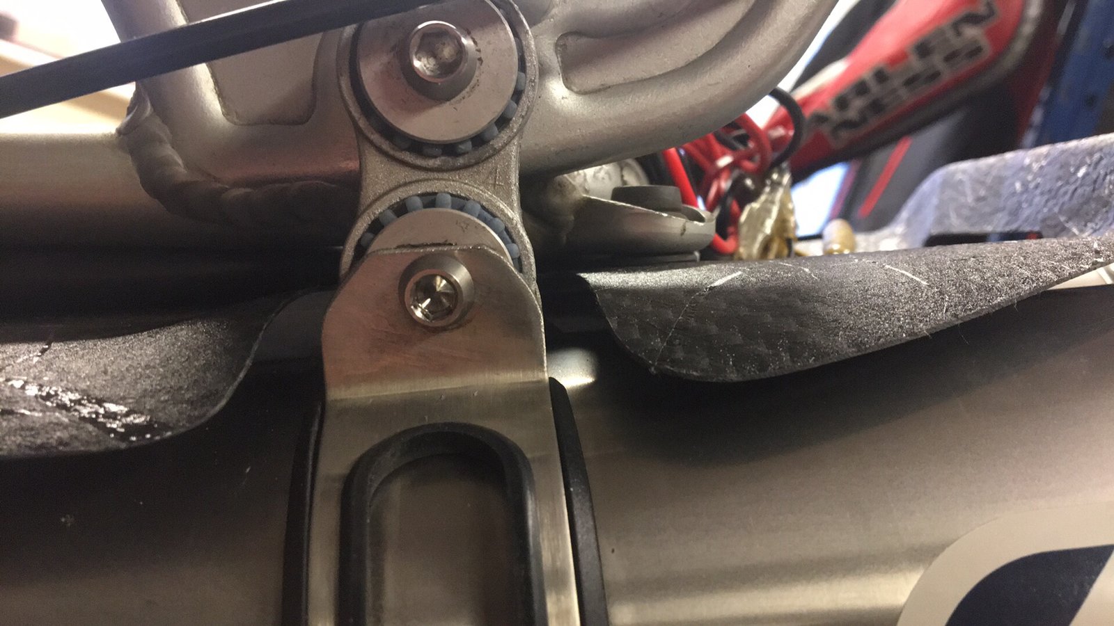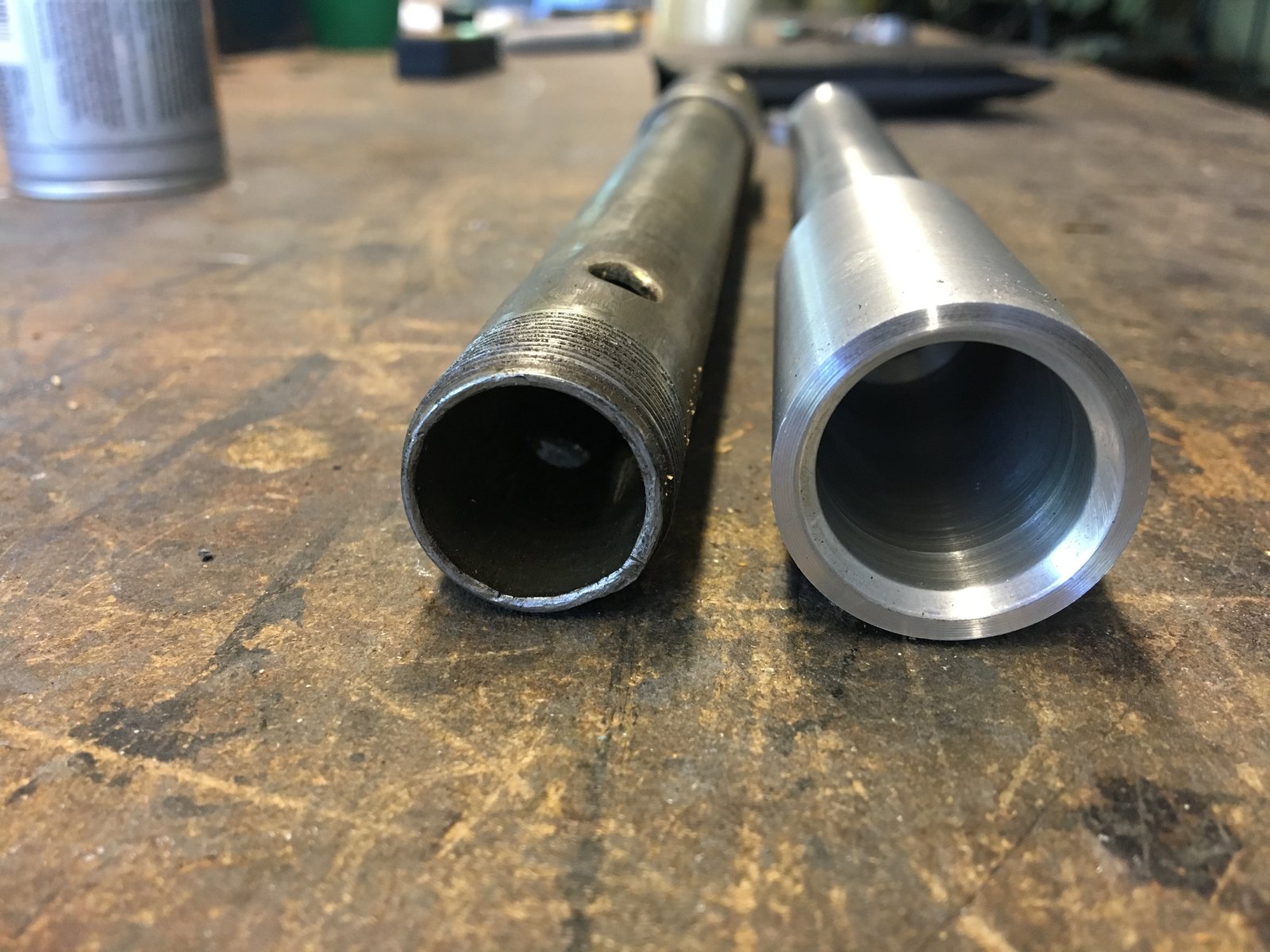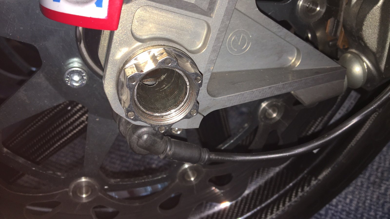 New front axle made up from T6 7076 alloy. 5mm wall thickness and 10mm longer then standard axle. Since fitting the Moto Corse fork bottoms, the std axle fell a bit short. Before Now