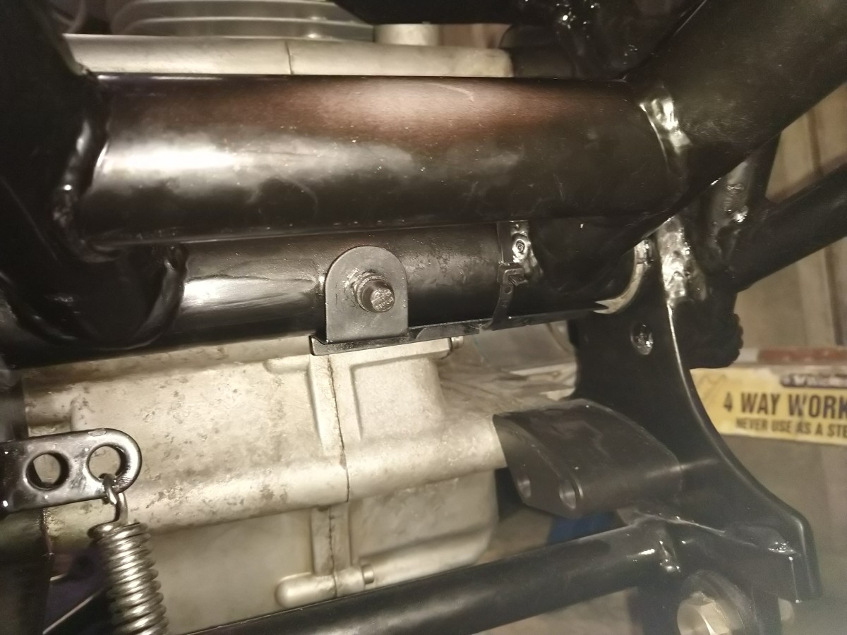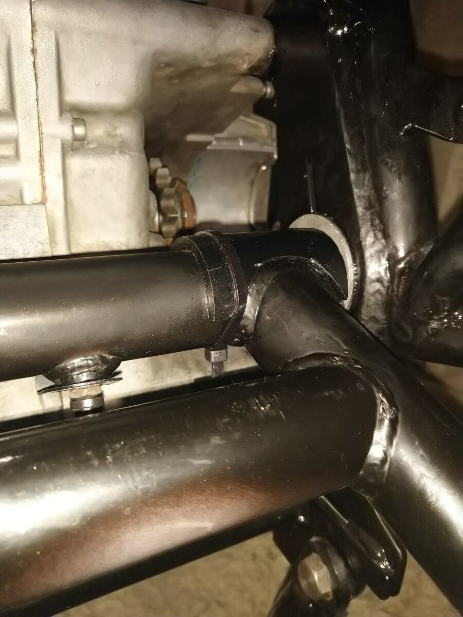 5. One other issue I can think of is the drive chain cutting into the swingarm & engine casing. There are mounting points in the frame for an off the shelf protector that sits underneath the swingarm and protects the casing but there is none available for protecting the swingarm. There is one available for the SS swingarm but as this differs from the Darmah I made my own up from a bought tube of some sort of tough plastic - I forgot what it was.